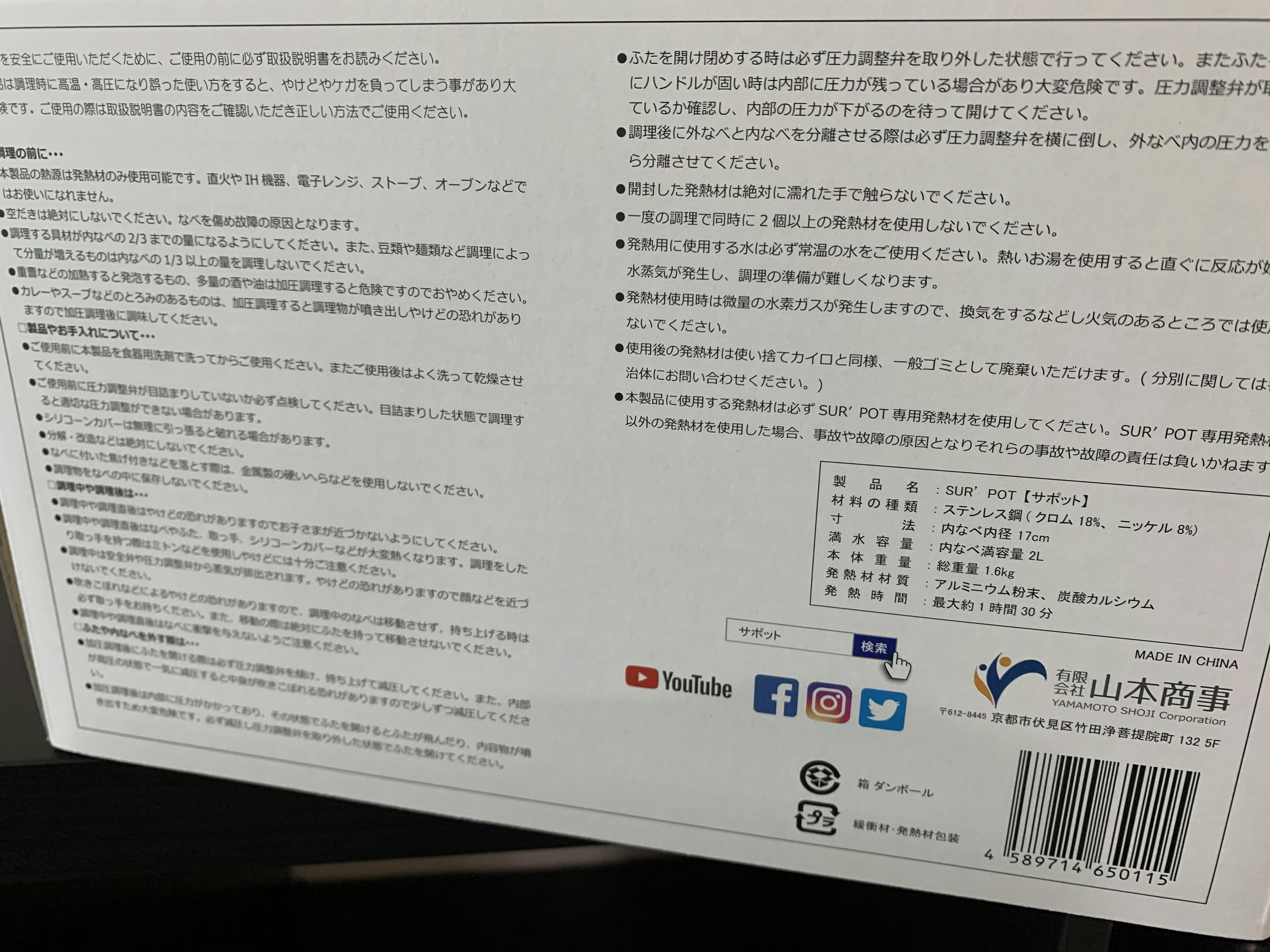 ※画像は発熱剤で調理するなべ「サポット」の注意書きです。