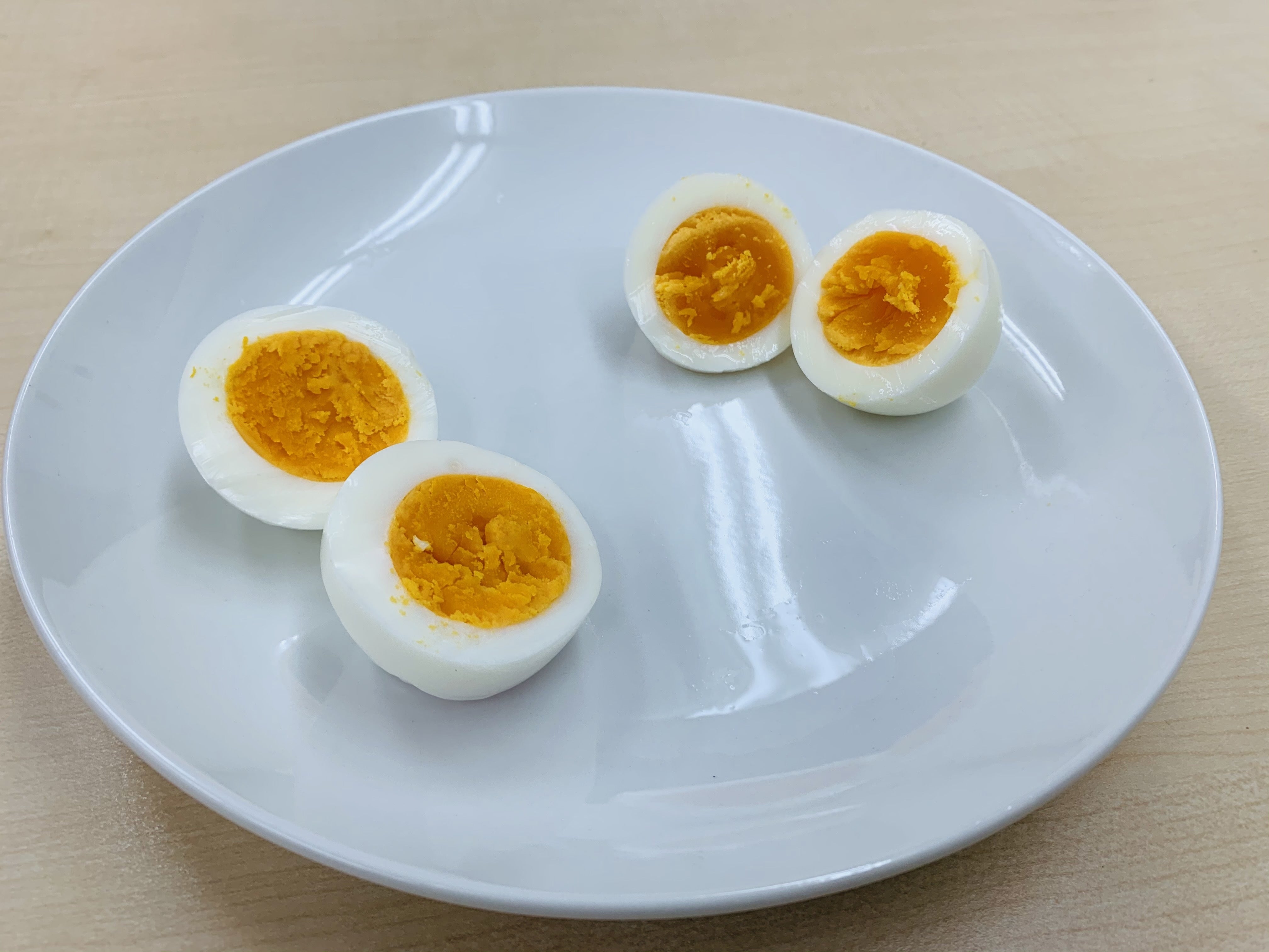”ピピピッ” タイマーが鳴ったので中身を取り出します。※当然ですがゆで卵なのでめちゃくちゃ熱いです。お玉などで取り出すなどして下さい。