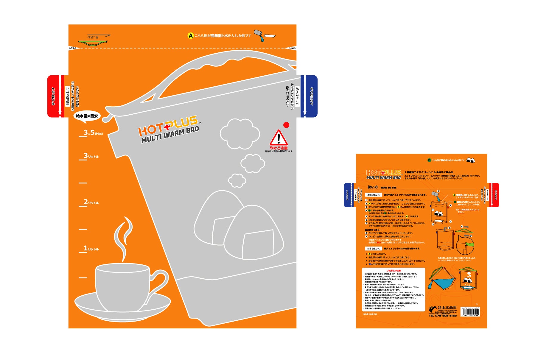 開発秘話⑯「情熱のオレンジ」「おにぎりをそのまま温められる2層袋」の両サイドに、”沸かしたお湯”を外に出すための注水口を追加し、いよいよ本格的に袋のデザインを描き始める事になったのですが・・・メインカラーを決めるだけで数日悩んだ挙句、友人・知人片っ端から意見を聞くものの、皆さんバラバラでかえって悩みが深まるという始末。「アウトドアっぽく茶系が良いと思う」「青は食べ物と合わないんじゃない?」「赤だとアツアツのイメージ」ということで、もう自分で決めます。(> <)温かい食事でホッと安心できるよう「オレンジ」をメインカラーに、バランスを考えハンドルは鮮やかな「グリーン」で。意見くれた皆さん、好みじゃなかったらごめんなさい・・・でもホント参考になりました!(笑)開発時からこだわりだった「おにぎり」を袋の中に、沸かしたお湯で淹れた「コーヒー」を袋の外にそれぞれ配置しデザイナーにバトンタッチ。レジャーでは楽しさが、非常時には安心が届きますように。続く・・・