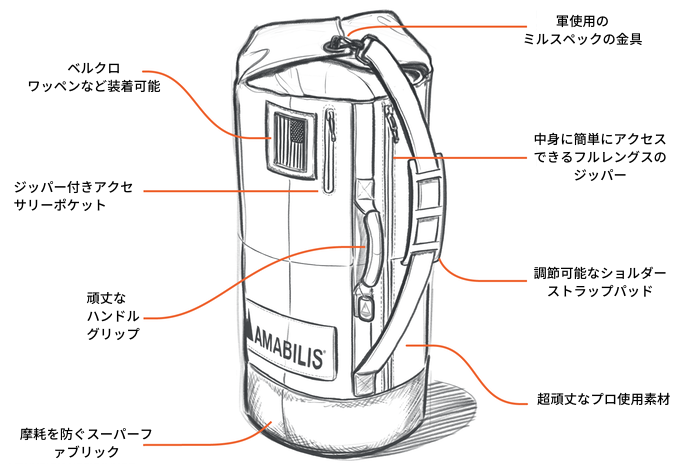 元軍用アパレルメーカーAMABILISが開発した地球上で最もタフな防水ダッフルバッグ「Dave Jr 2.0」は、ジムや旅行のみならず、普段使いにも最適な逸品です。Dave Jr 2.0は、米国特殊作戦軍の基準を満たしており、永久保証付きです。