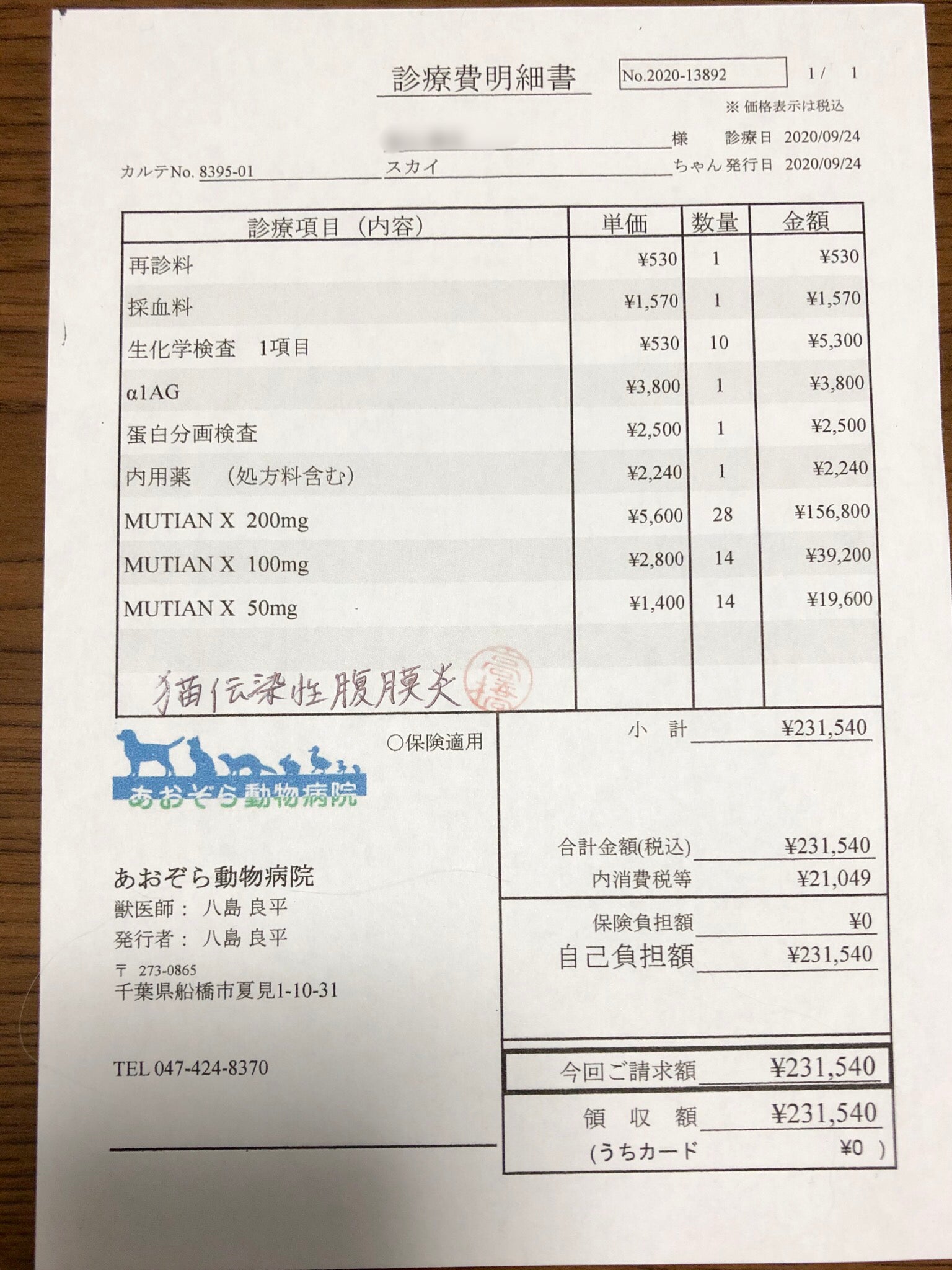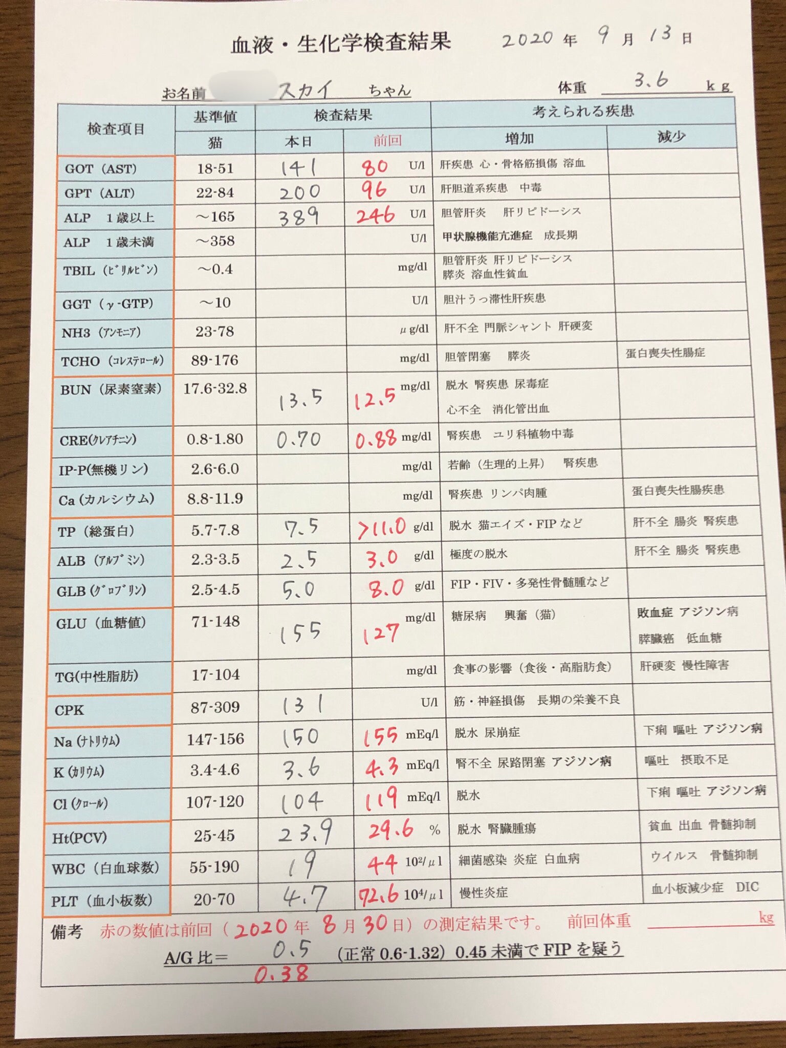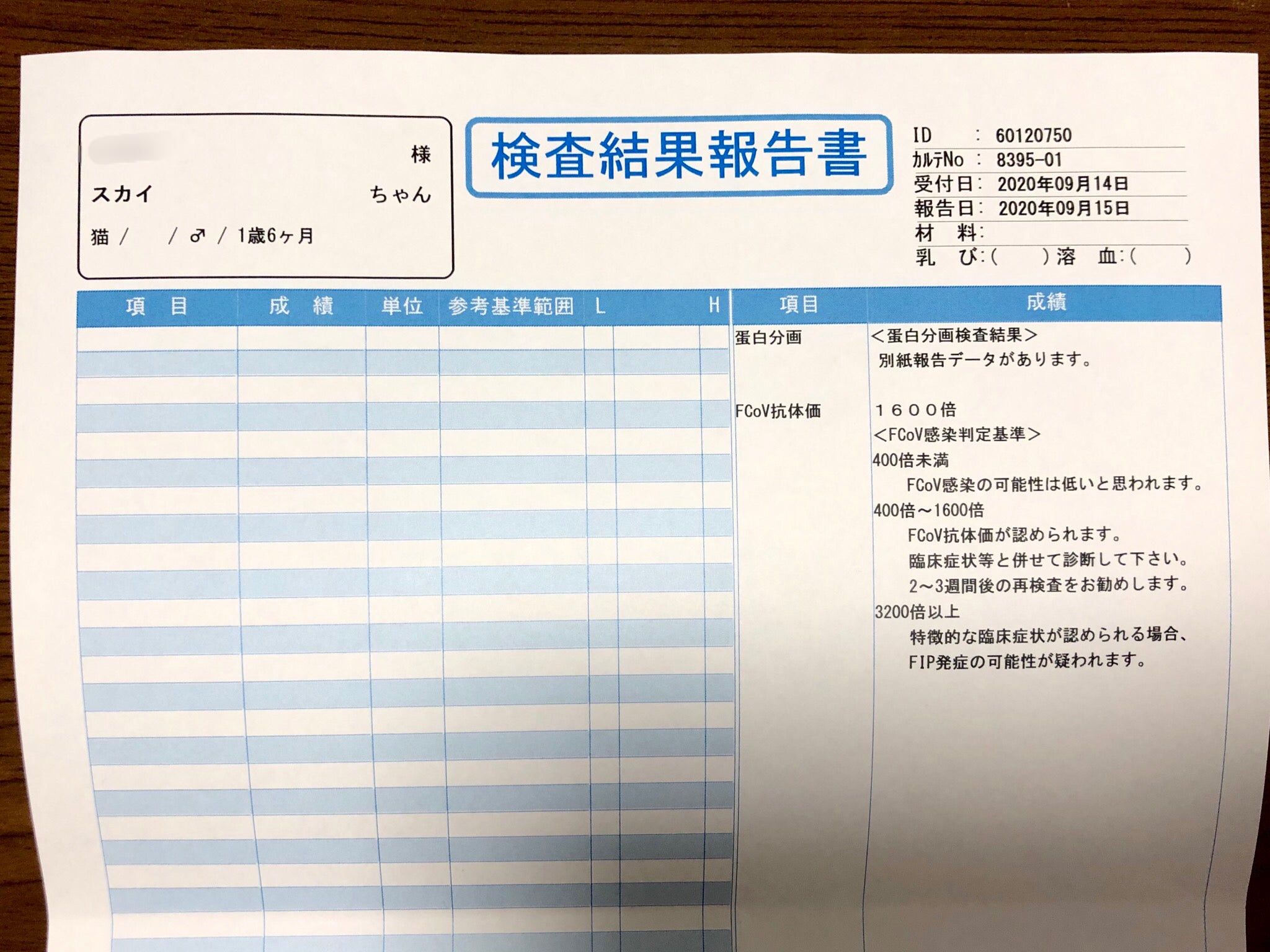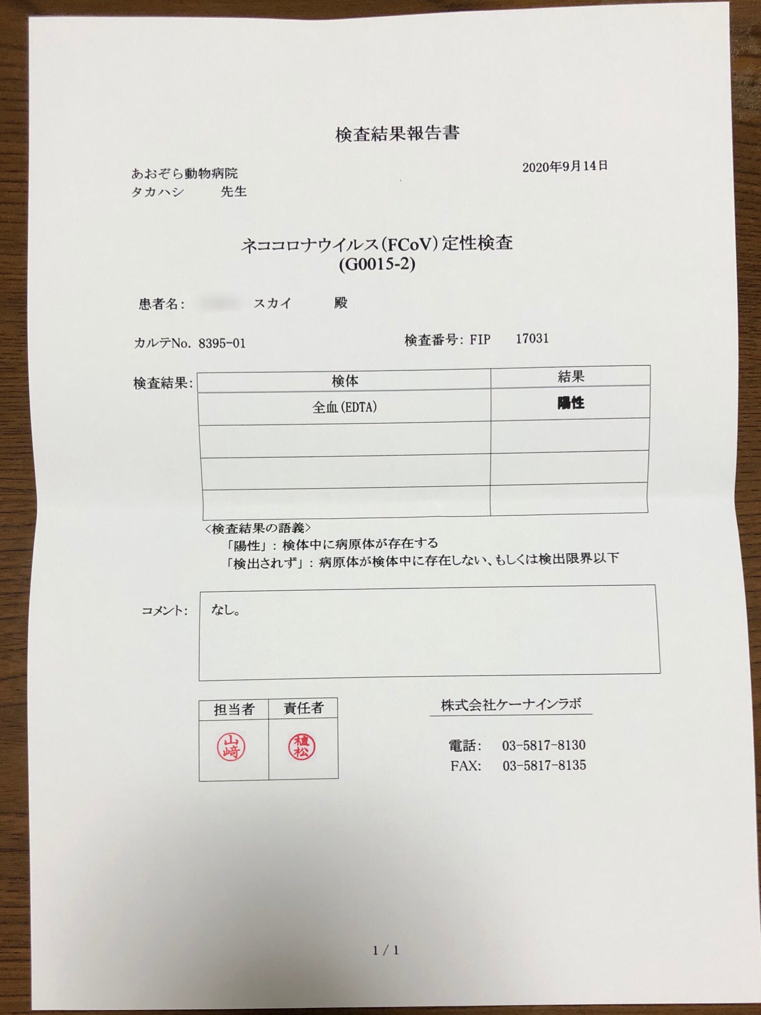 9/24には遺伝子検査や血液中のタンパクの検査、抗体検査の結果から、FIPで確定だと診断を受けました。