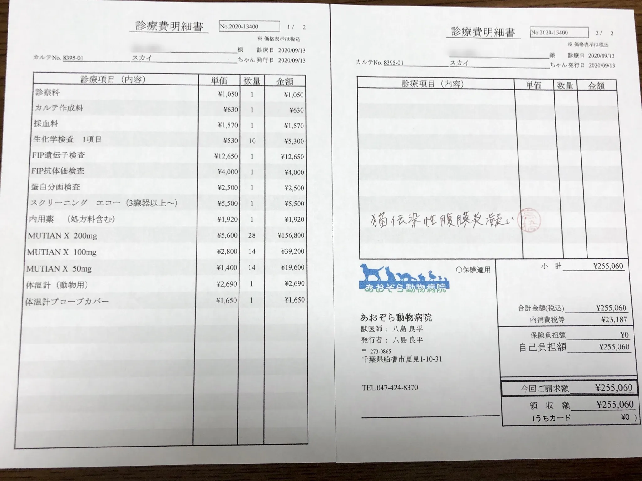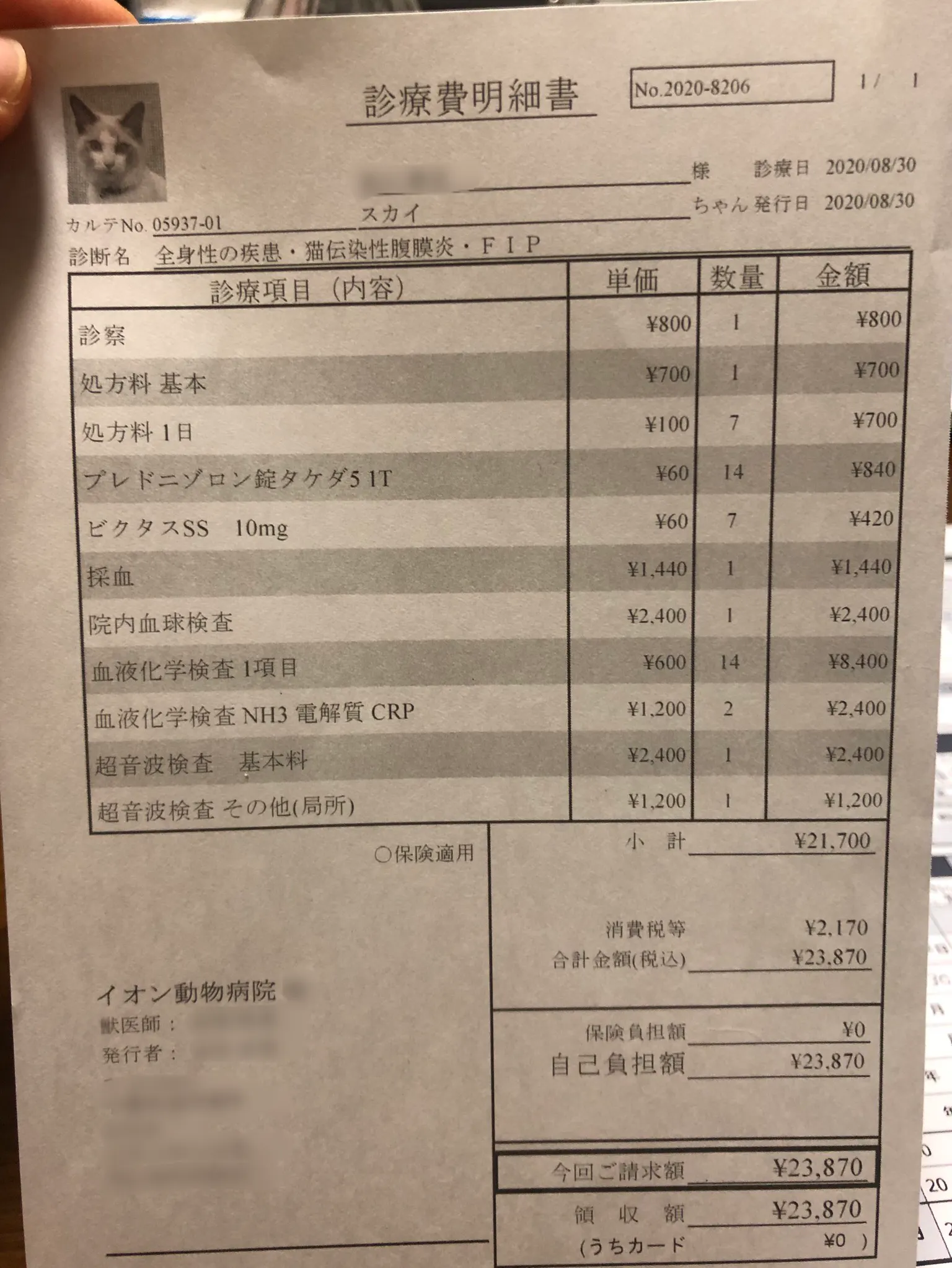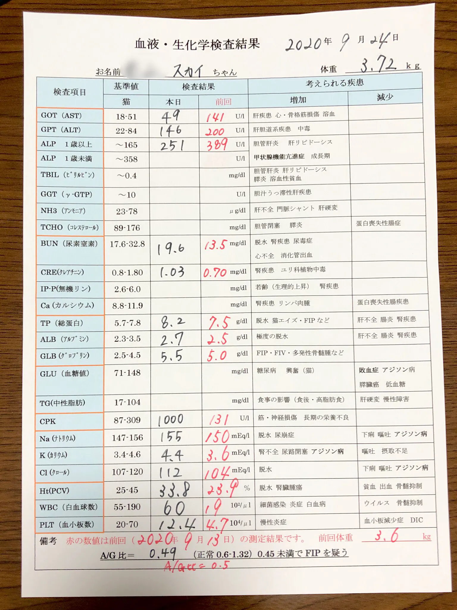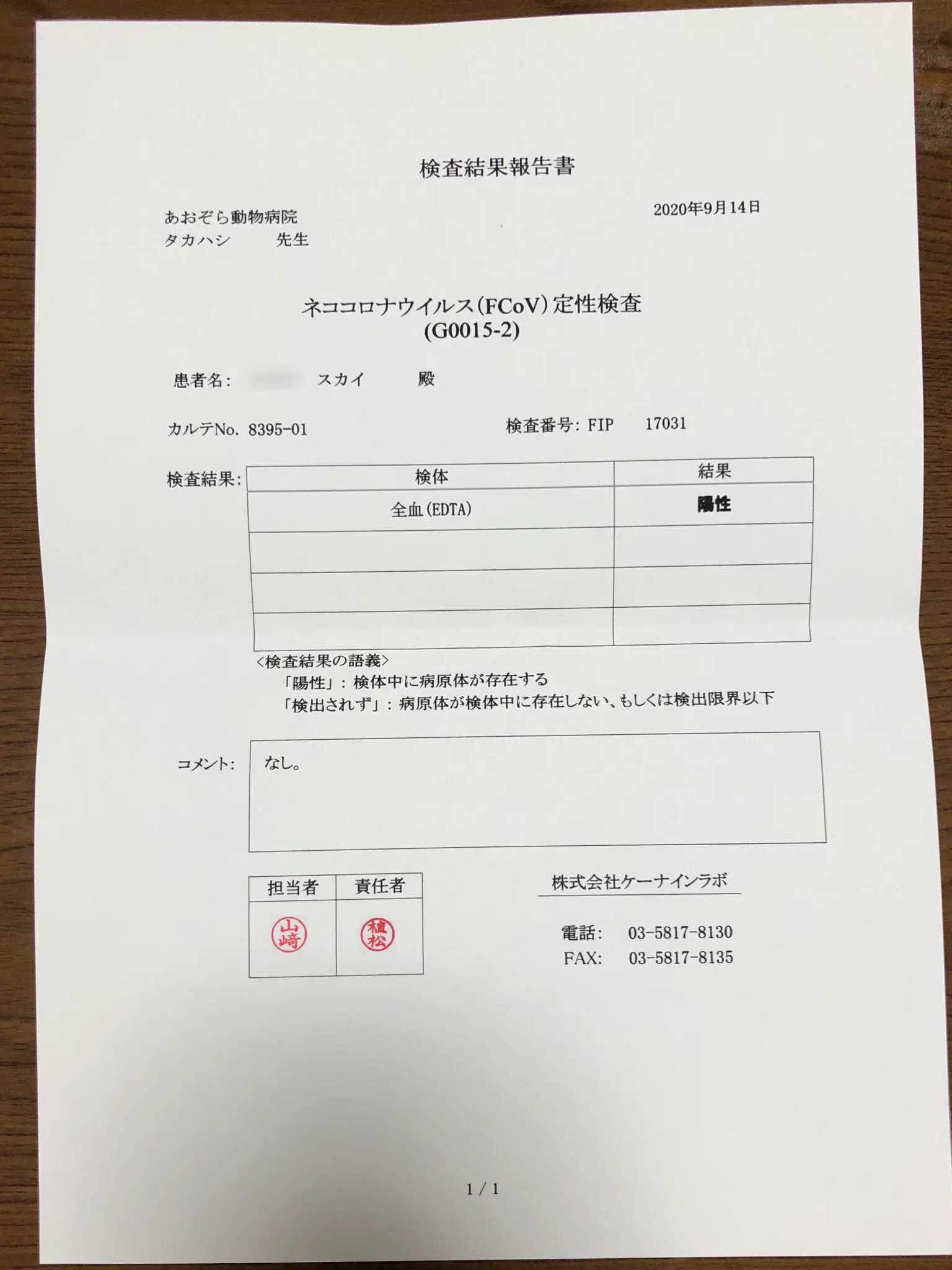 9/24には遺伝子検査や血液中のタンパクの検査、抗体検査の結果から、FIPで確定だと診断を受けました。