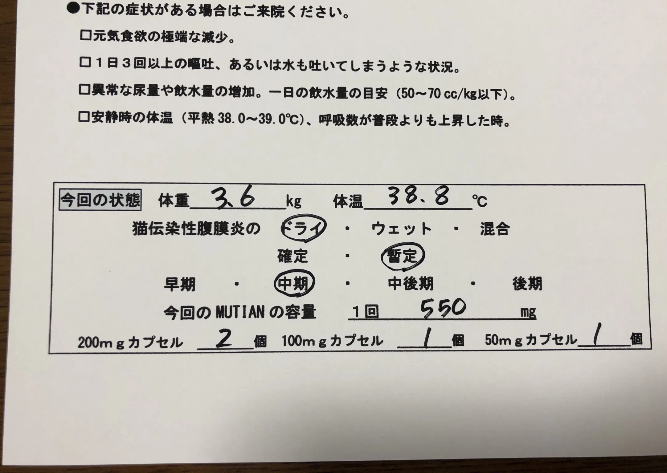 この時点では確定診断ではなく疑いですが、血液検査の結果が前回より悪化していたため薬は早めに始めたほうが良いとDr.より指示を受け、薬(mutian)を開始しています。