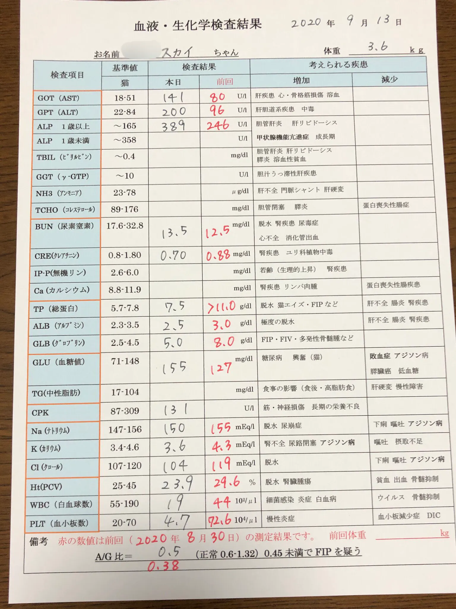 また、もともと体重4.4kgあった子ですが、治療開始時には3.6kgまで減少していました。