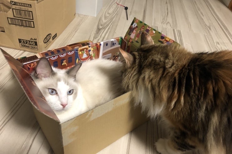 食欲が出て体力が回復したためか、少しおもちゃで遊ぶ姿を見ることもできるようになりました。そして同居猫にも構うようになりました。