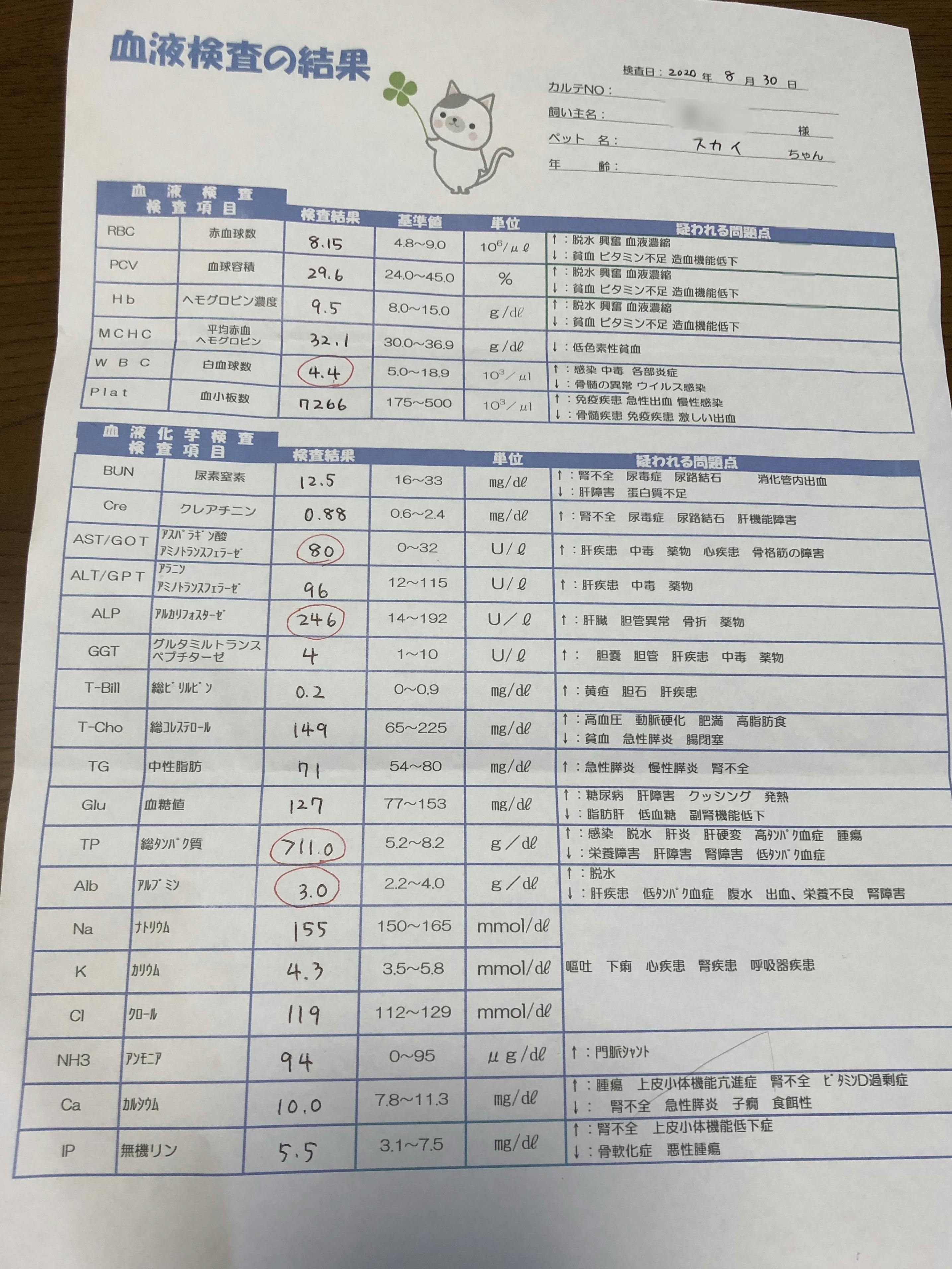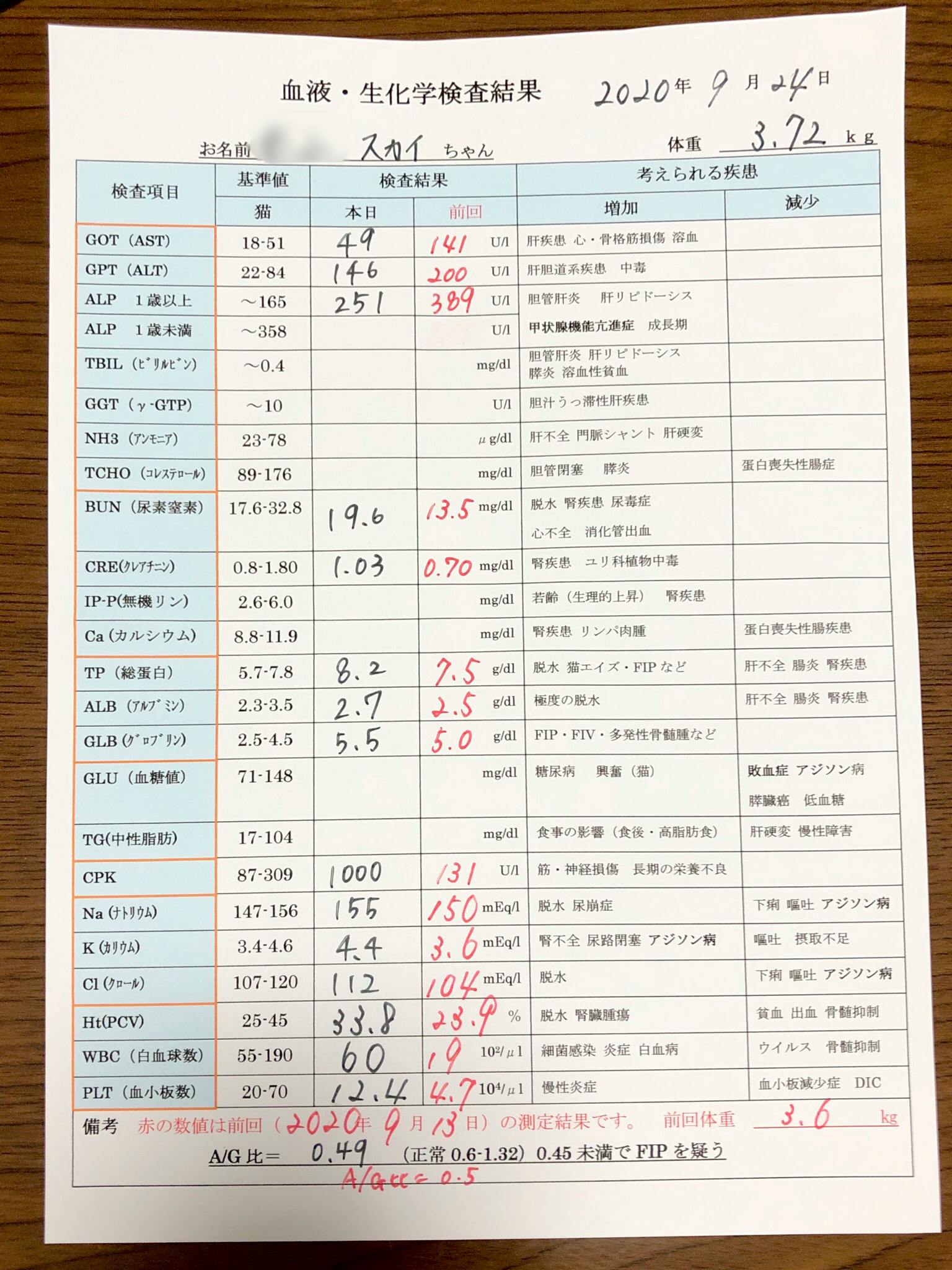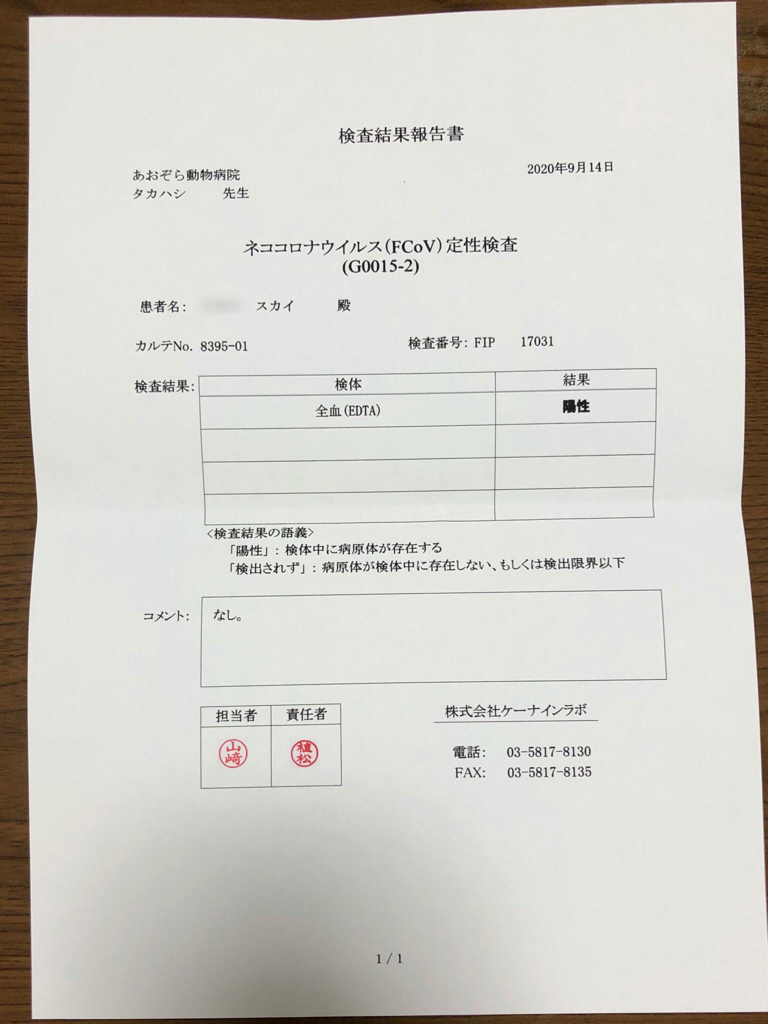9/24には遺伝子検査や血液中のタンパクの検査、抗体検査の結果から、FIPで確定だと診断を受けました。