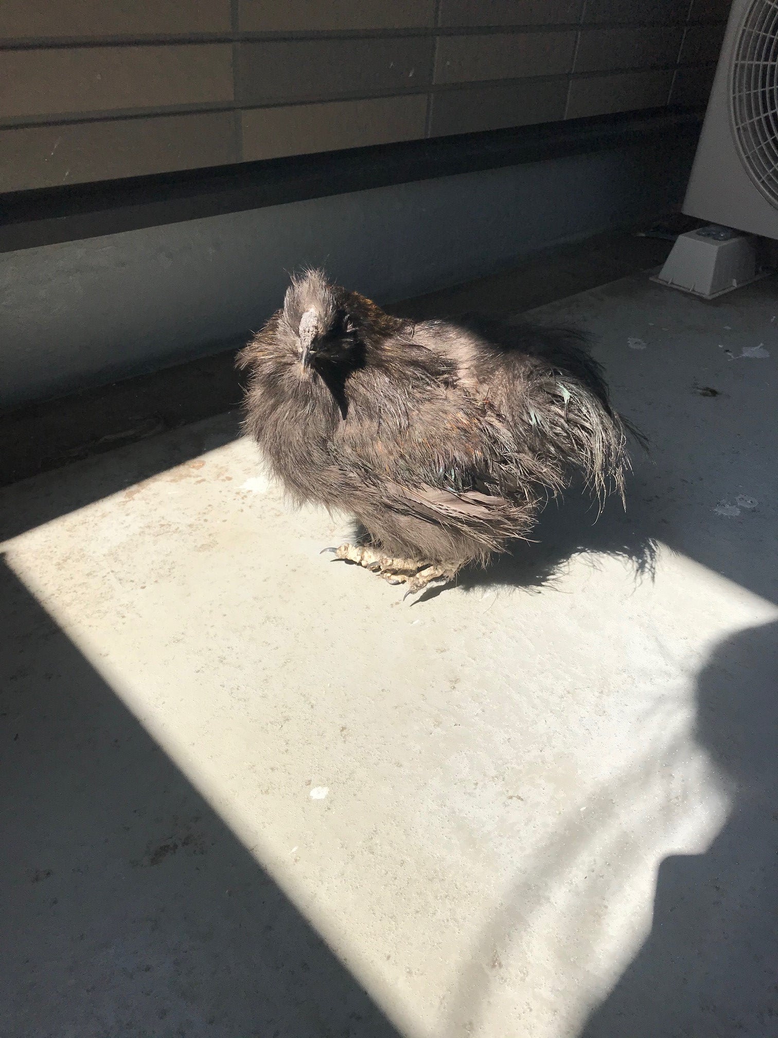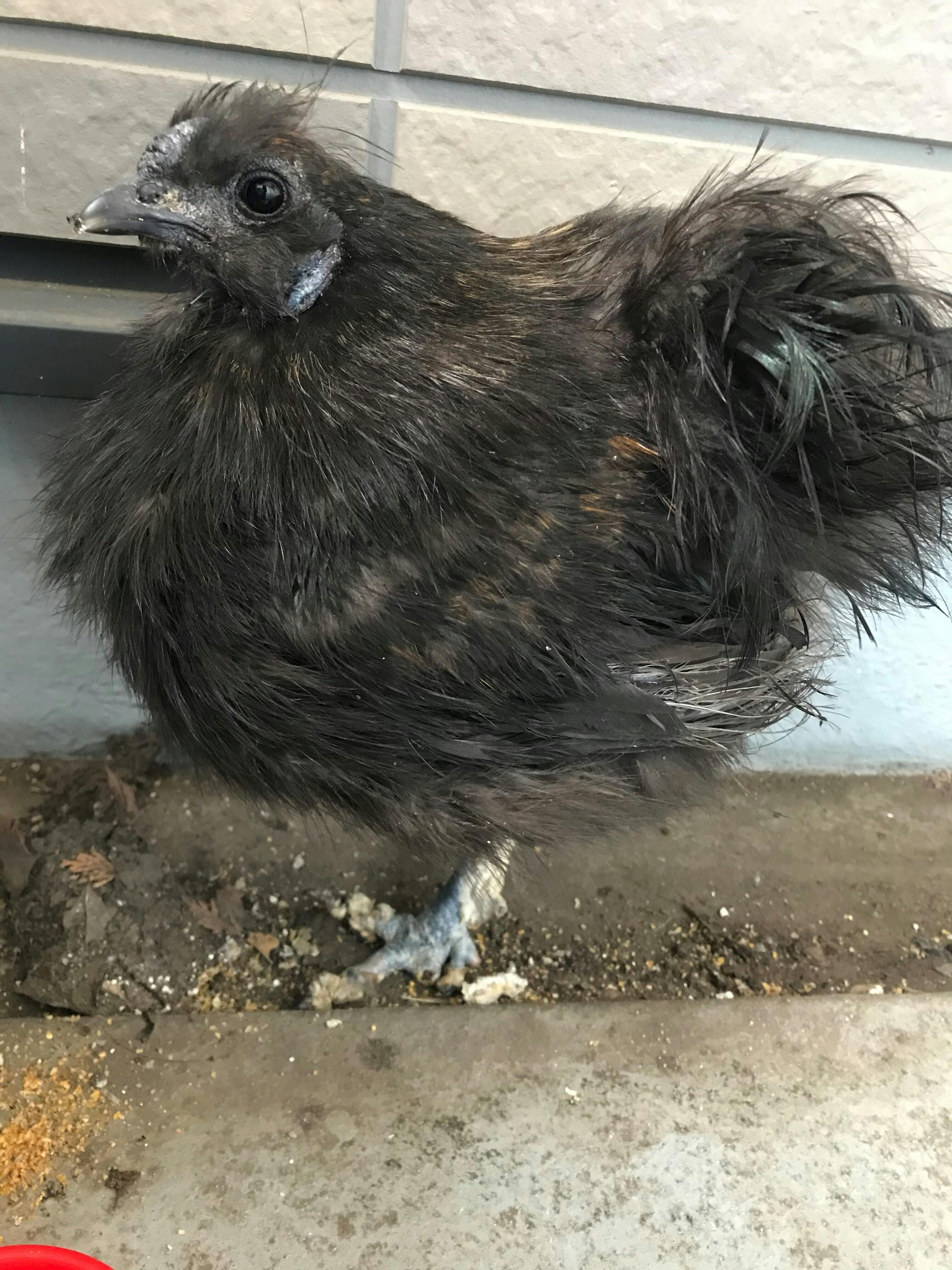 羽がほとんど真っ黒で、耳のような部分が青い黒烏骨鶏でした。
