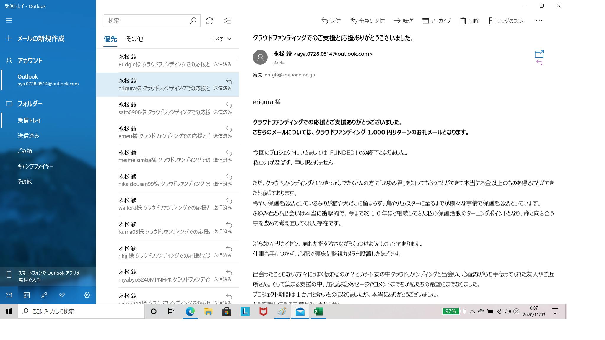 本日1,000円のリターンの方へのお礼メールの送信が完了いたしました♪