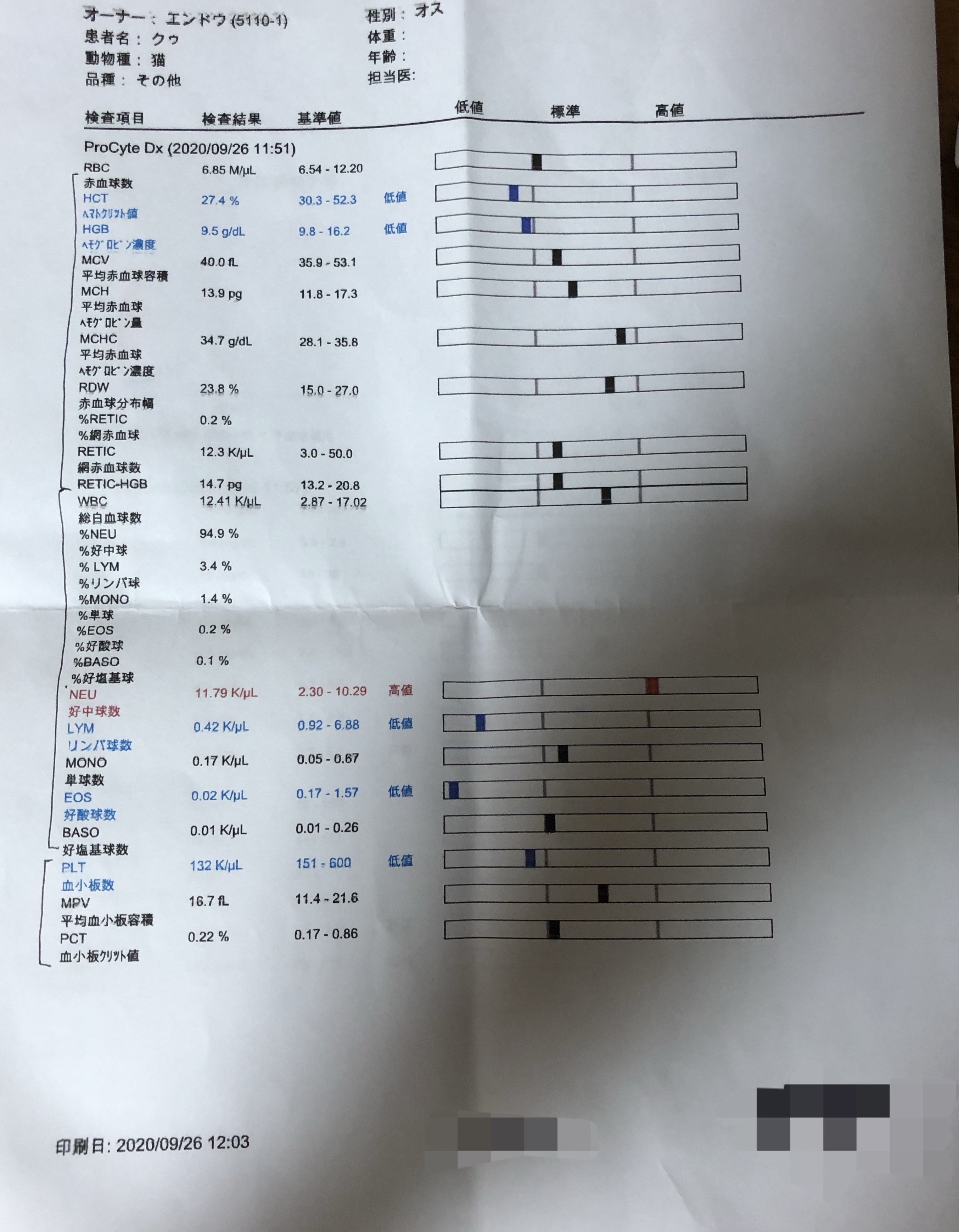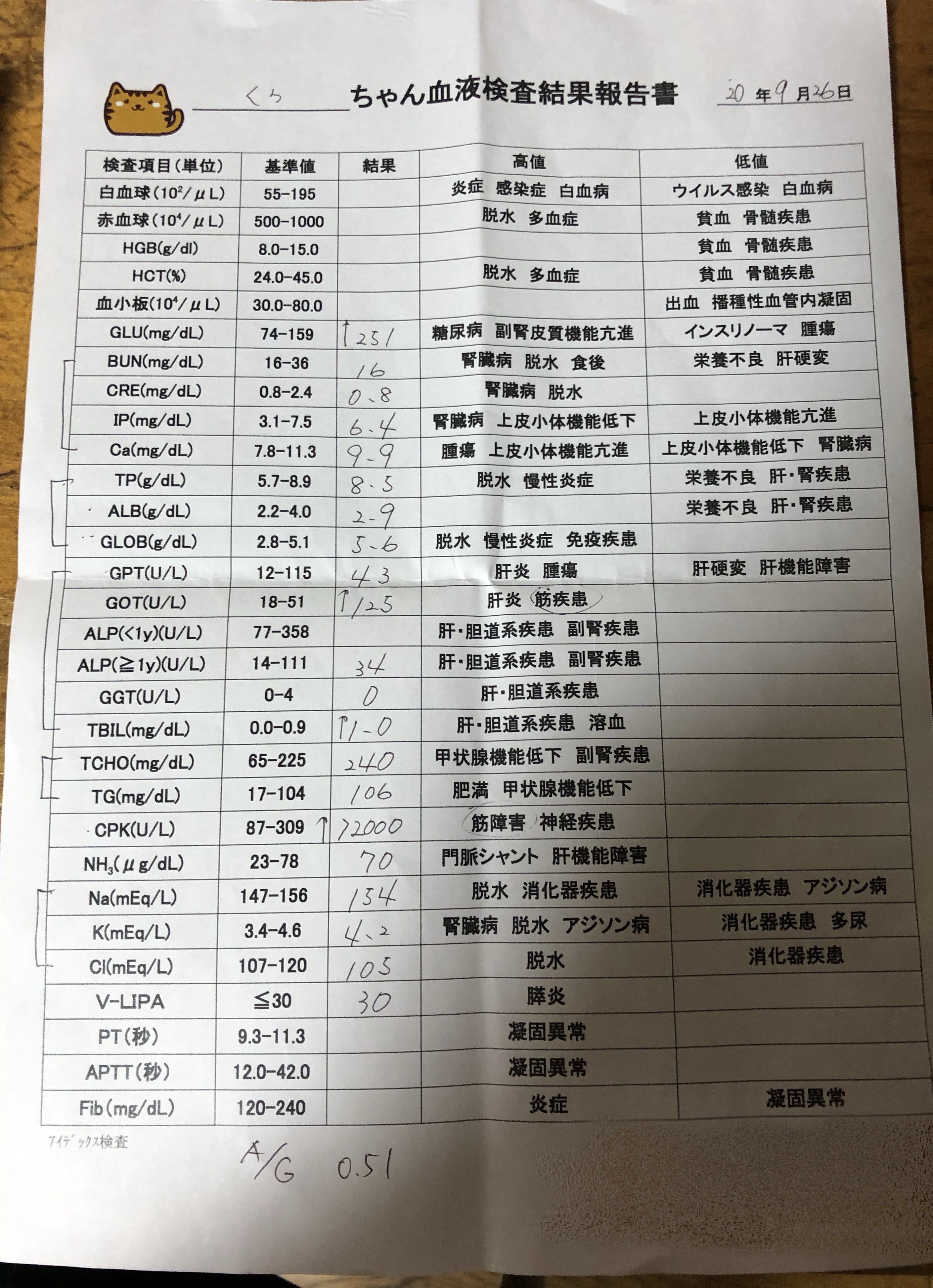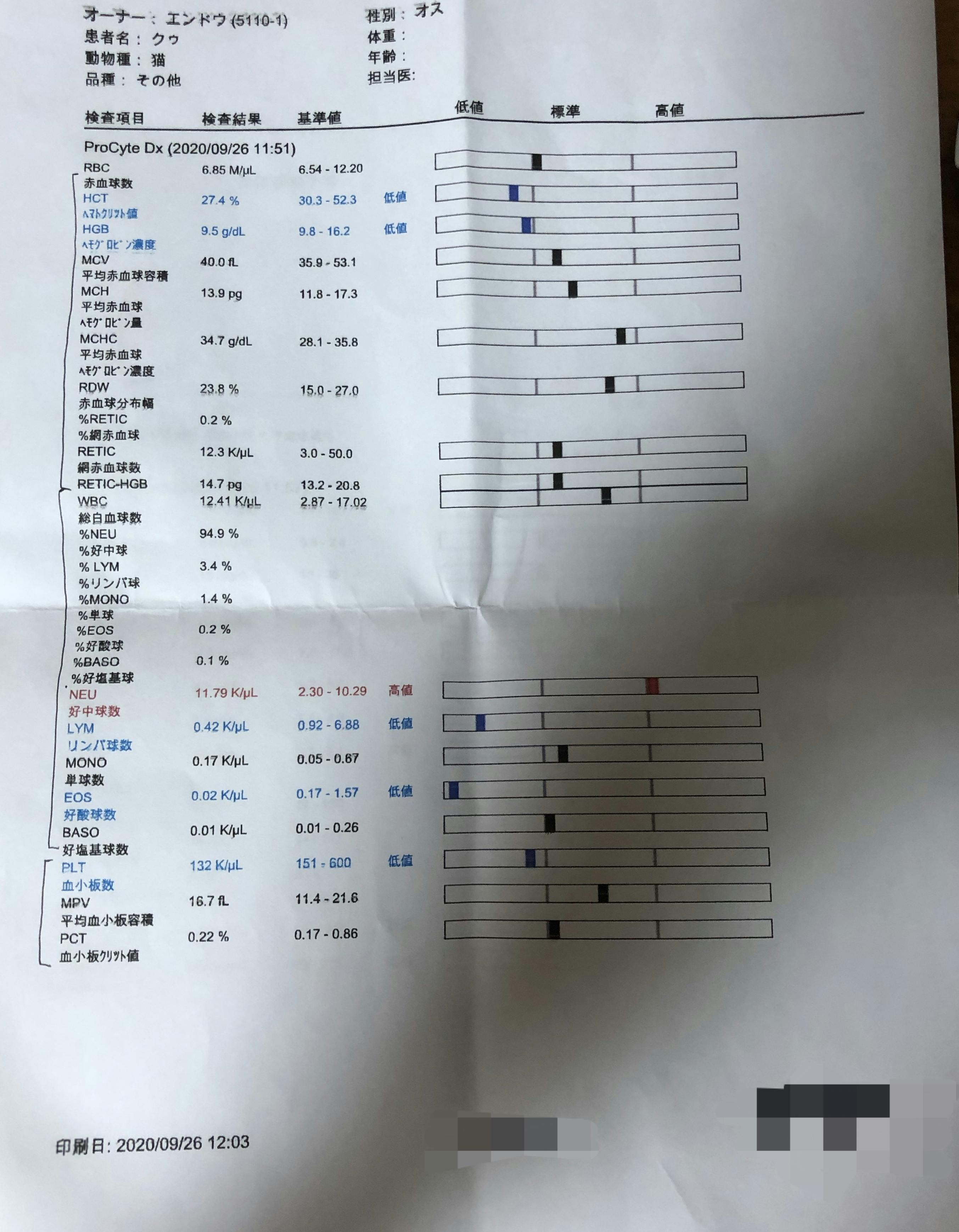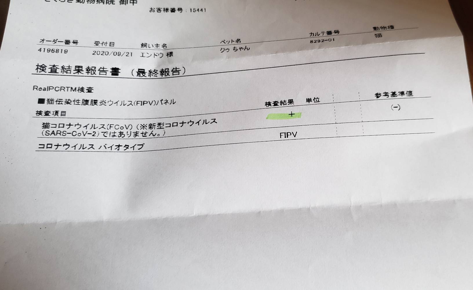 9月23日→いつもの様に注射をしに病院を受診した際、9月19日のPCRの検査結果が出ていました。FIP「ウエットタイプ」確定診断。