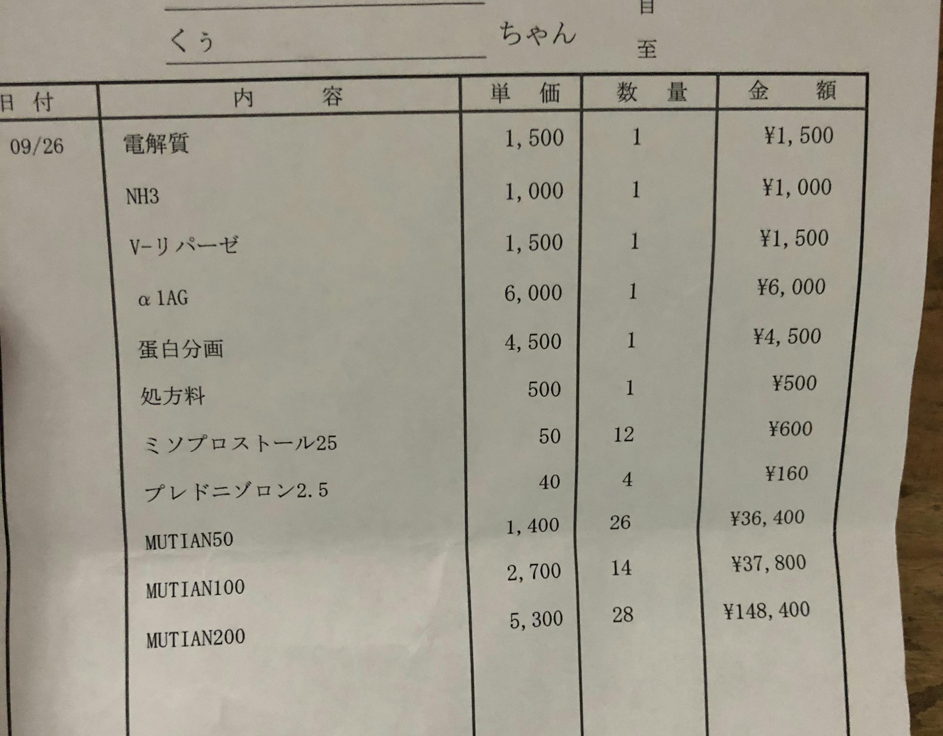10月18日時点で体重が5.8キロで、5.5から増えるとお薬も50mg増えるため、1日のお薬の量が600mgになりました。1日のお薬代「15.900円」。