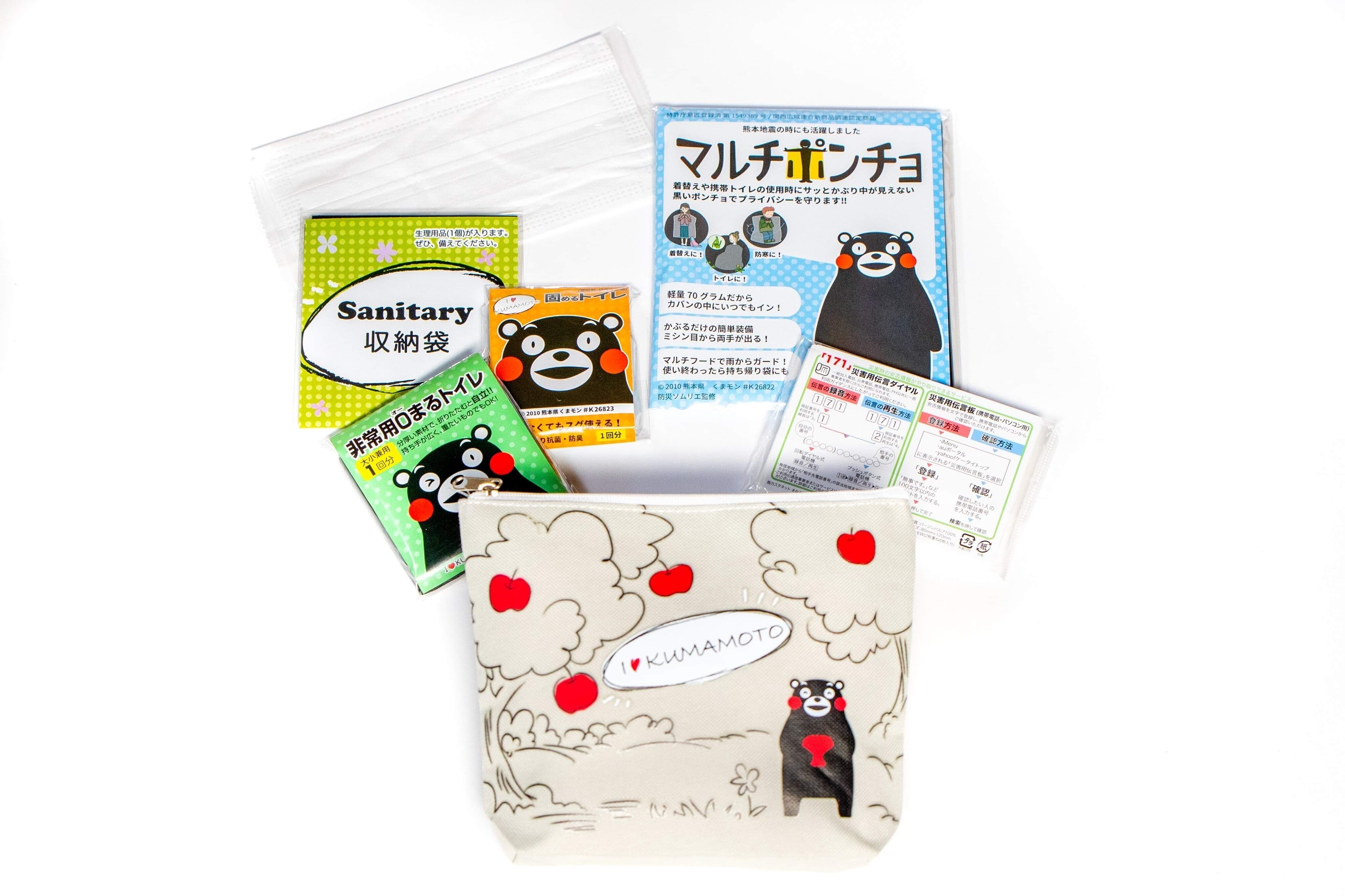 その後、熊本地震(2016年4月)被災地でヒヤリングから、防災用品を普段から化粧ポーチのように持ち歩ける形態として、くまモンデザインの防災ポーチ開発。