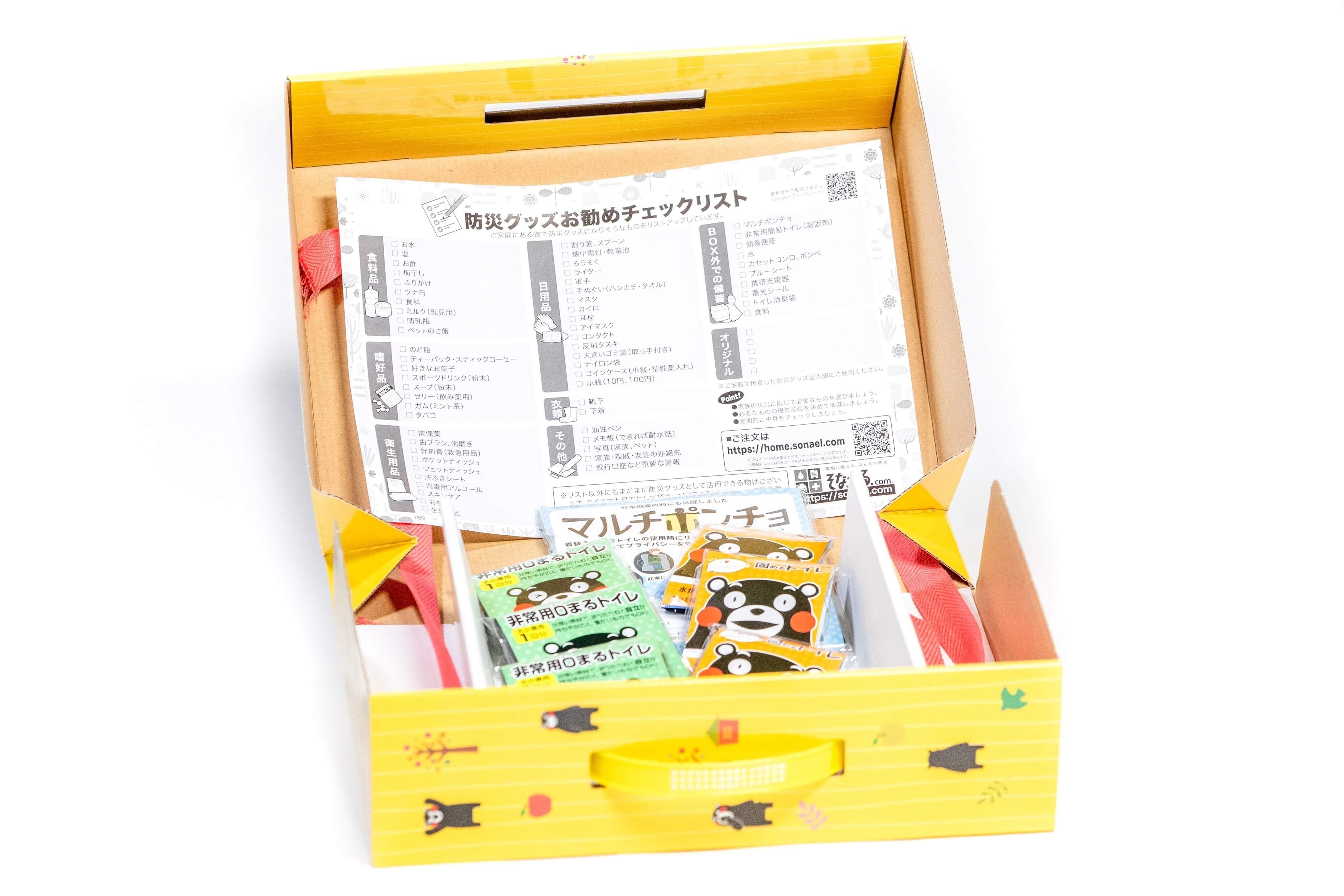 防災絆BOXの中には、一般家庭では入手が難しいマルチポンチョと非常用簡易トイレと、「防災グッズおお勧めチェックリスト」が入っています。チェックリストを見ながら、親子・家庭内で話し合って中身を備えることが防災意識を保つための機会となります。