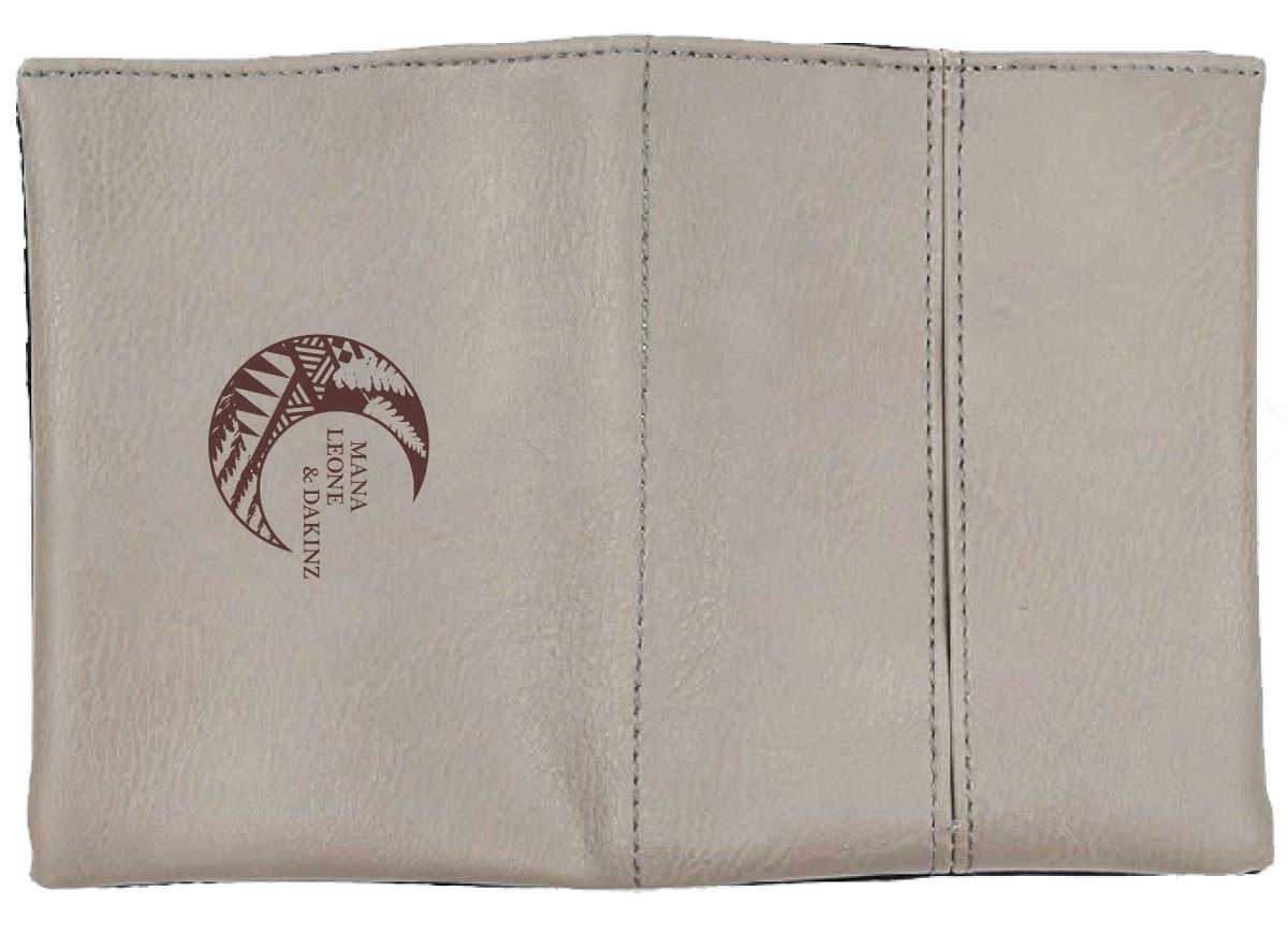 ポケットティッシュとマスク2枚を収納できるロゴマーク入りレザー調マルチマスクポーチ。
