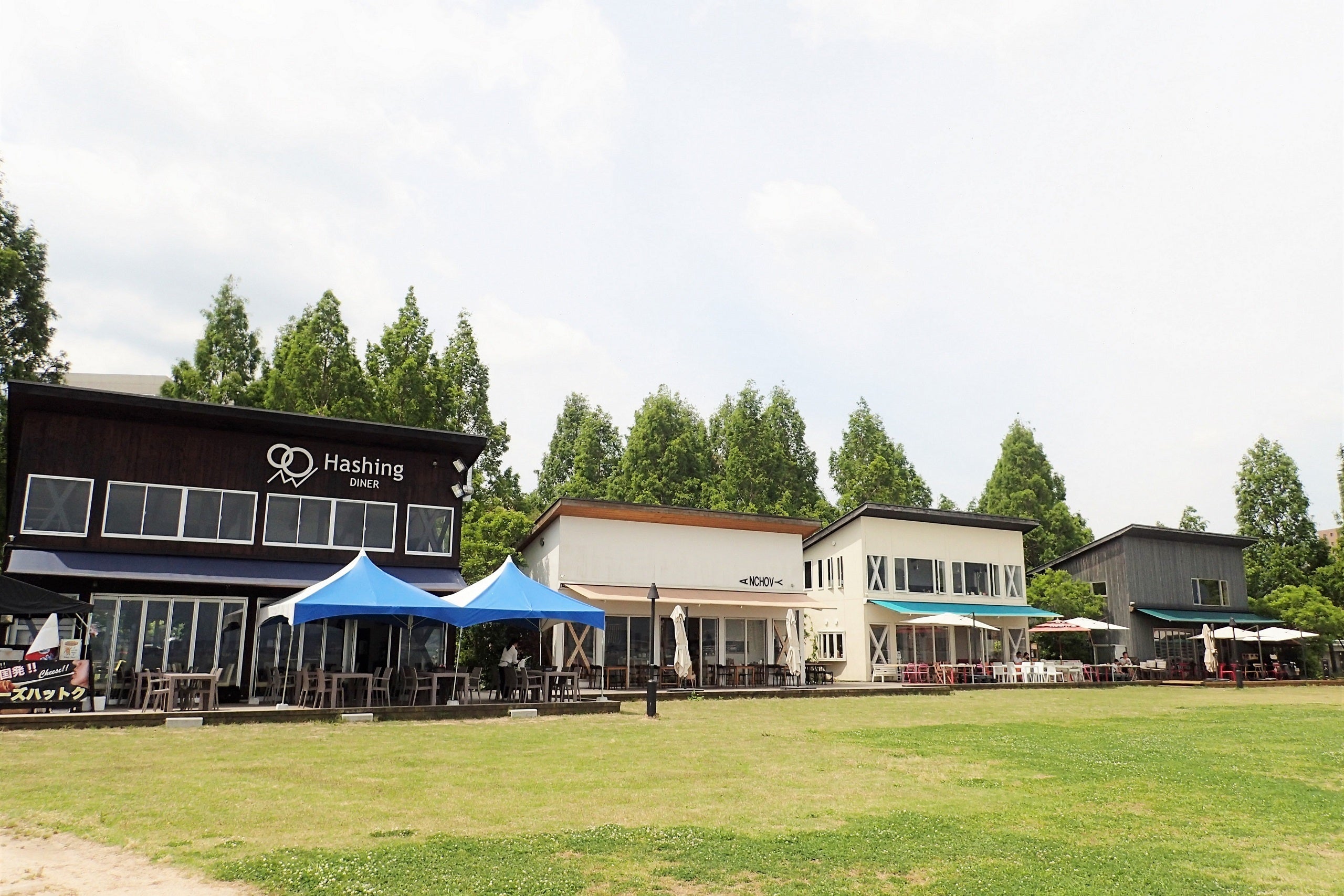 なぎさのテラス4店舗様とその前の芝生広場