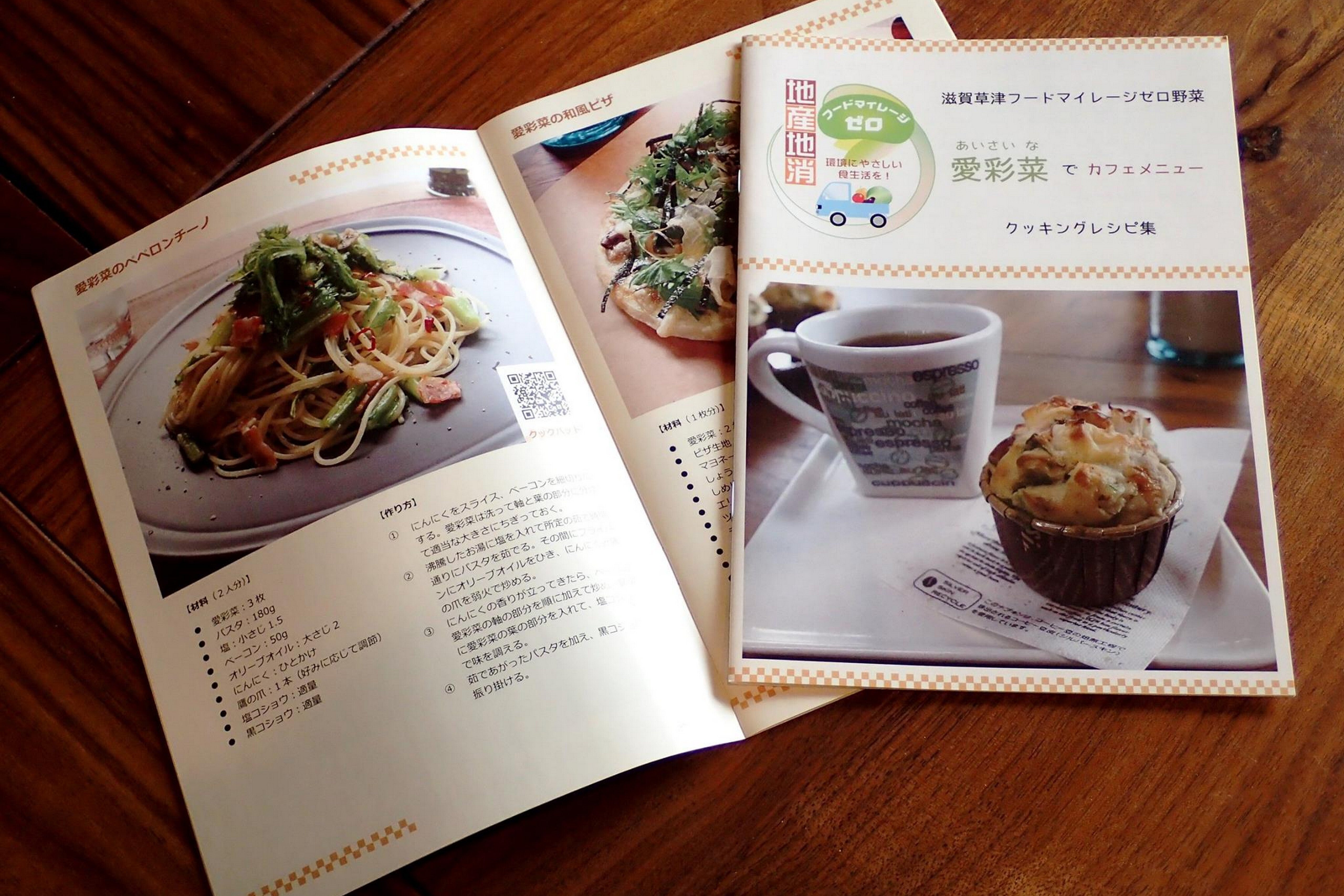 2015年度に取り組んだ「フードマイレージによる地産地消促進プロジェクト」では、大学のキャンパスがある滋賀県草津市の地野菜「愛彩菜」を取り上げ、それを使ったカフェメニューを開発して、レシピ集として発行いたしました(フルカラー、16ページ)。