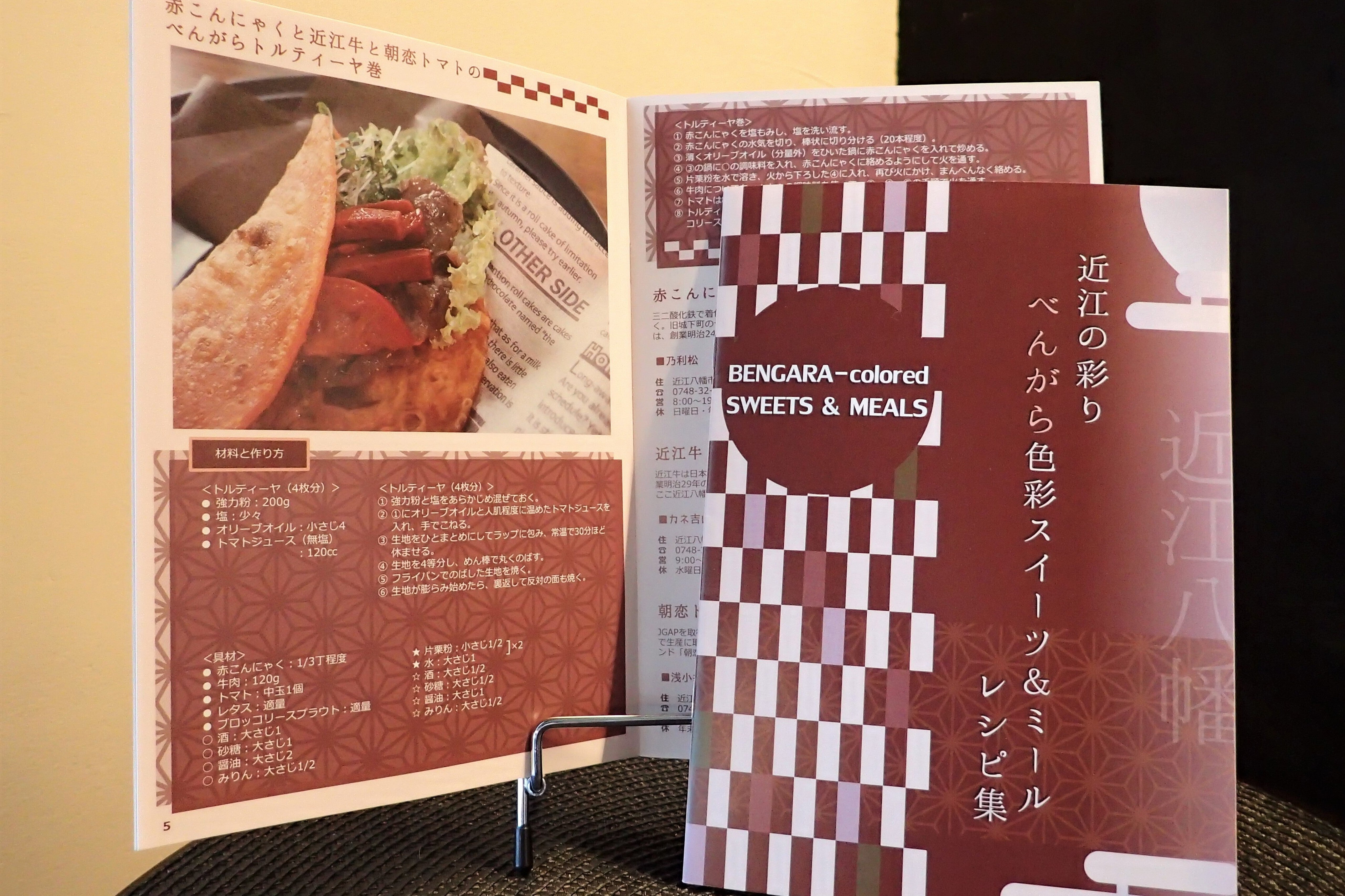 そのイベントでは、独自に考案したべんがら色のスイーツやスナックのレシピと、近江八幡とべんがらとの歴史文化的な関わりを紹介した冊子「べんがら色彩スイーツ&ミールレシピ集」を作成し、配布いたしました(フルカラー、16ページ)。
