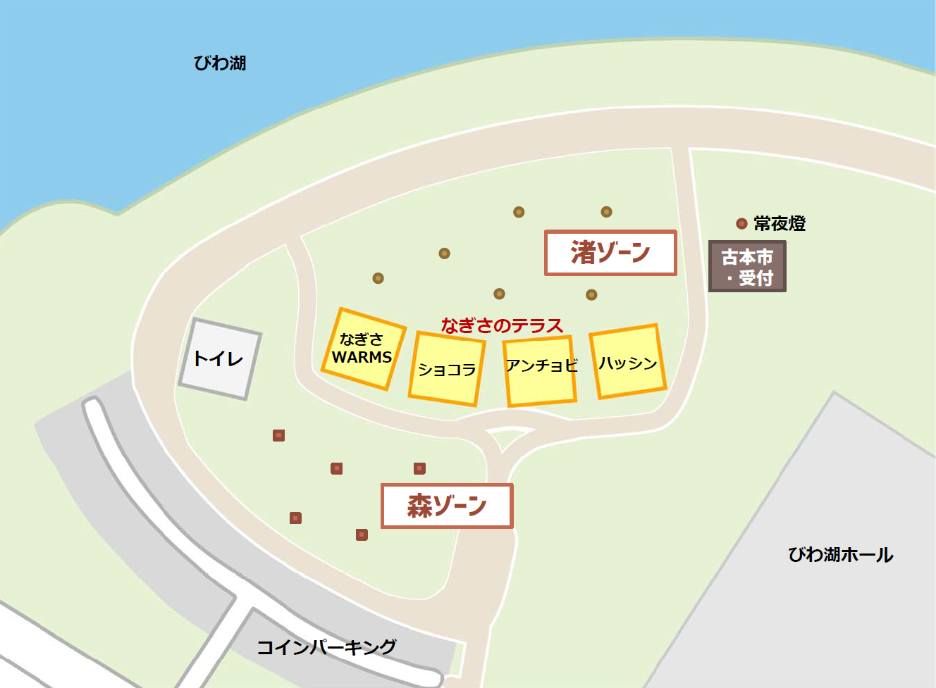 場所:「なぎさのテラス」(なぎさWARMS様、ショコラ様、アンチョビ様、ハッシン様)前の芝生広場と打出の森(古本市は常夜燈のある石畳スペース)