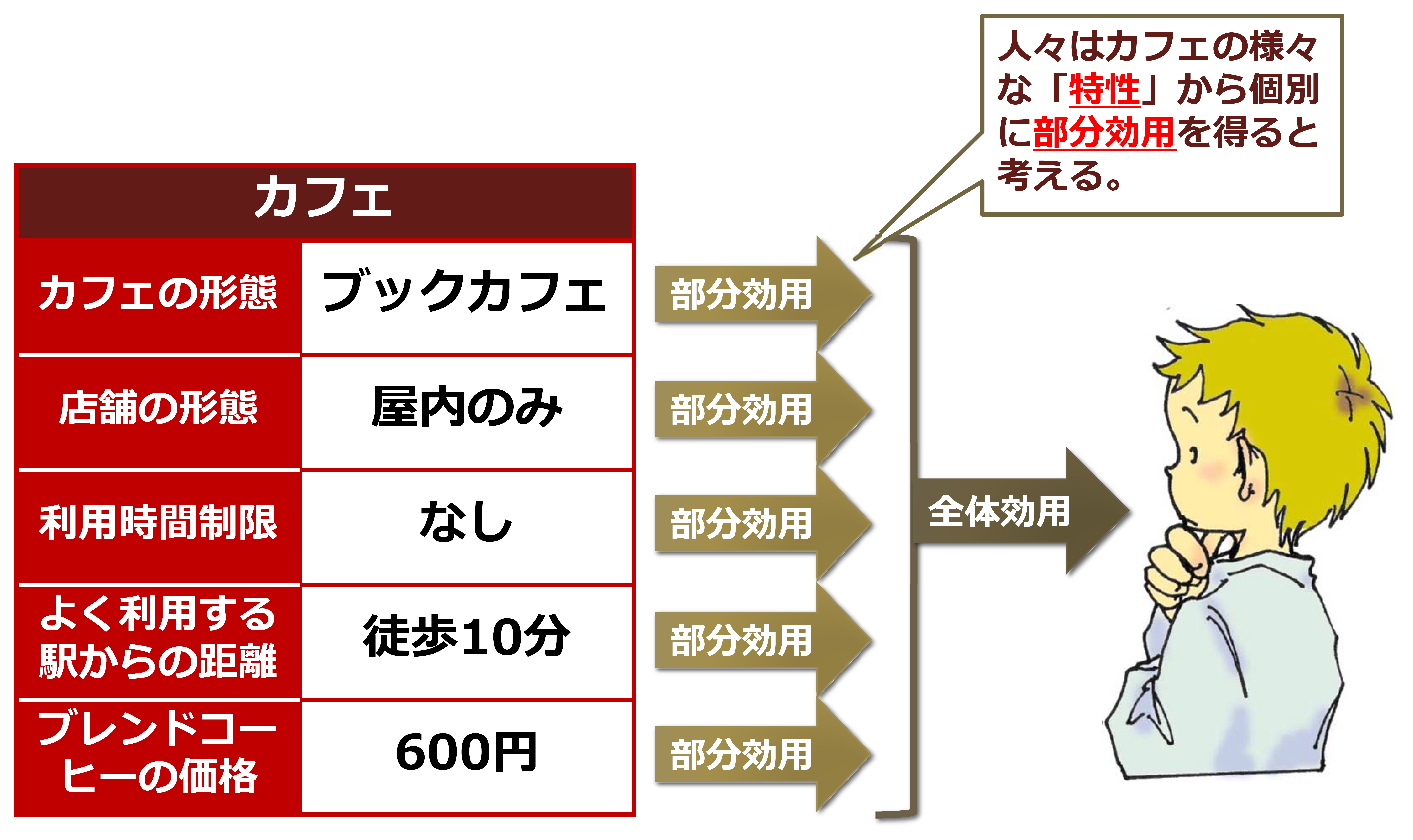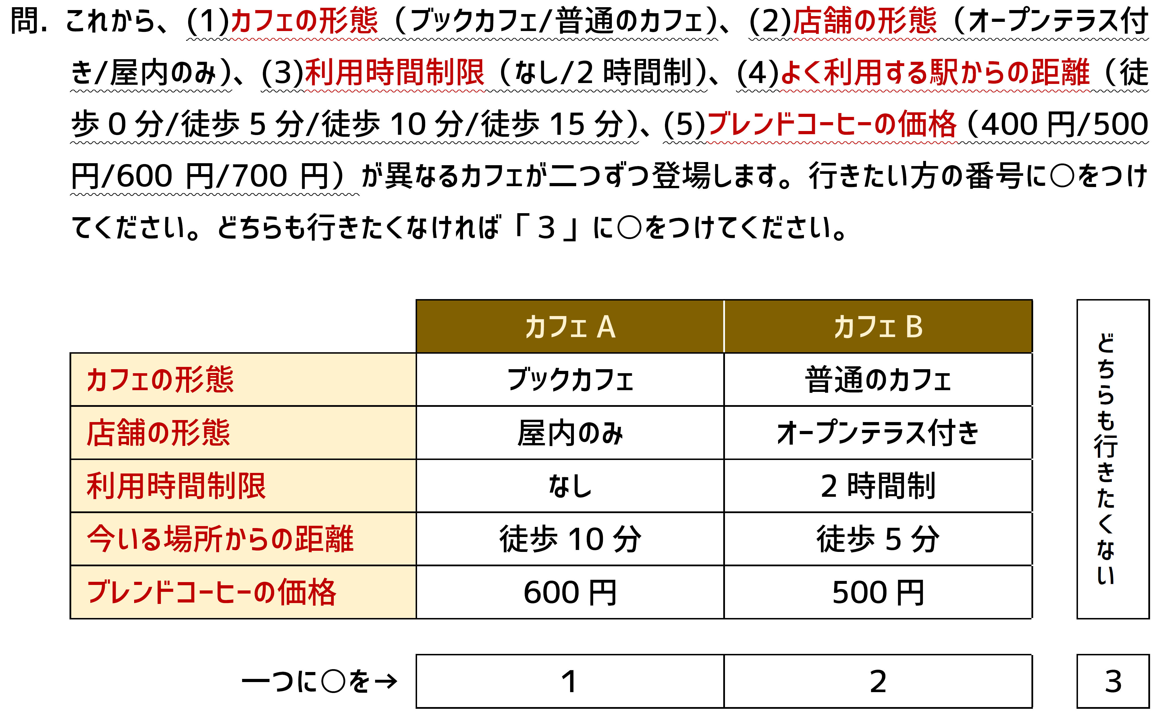 この調査によって得られたデータを分析することにより、最終的には「ブックカフェに行く代わりに高くなってもよいと思うコーヒーの価格」、「オープンテラス付きのカフェに行く代わりに高くなってもよいと思うコーヒーの価格」、「利用制限がないカフェに行く代わりに高くなってもよいと思うコーヒーの価格」が導かれます。