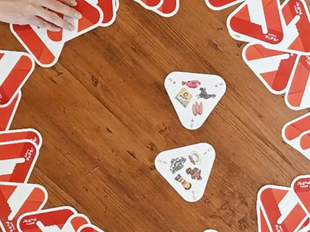 ・手札を1枚ずつめくって、場のカードと同じイラストを急いで見つけて重ねていきます。