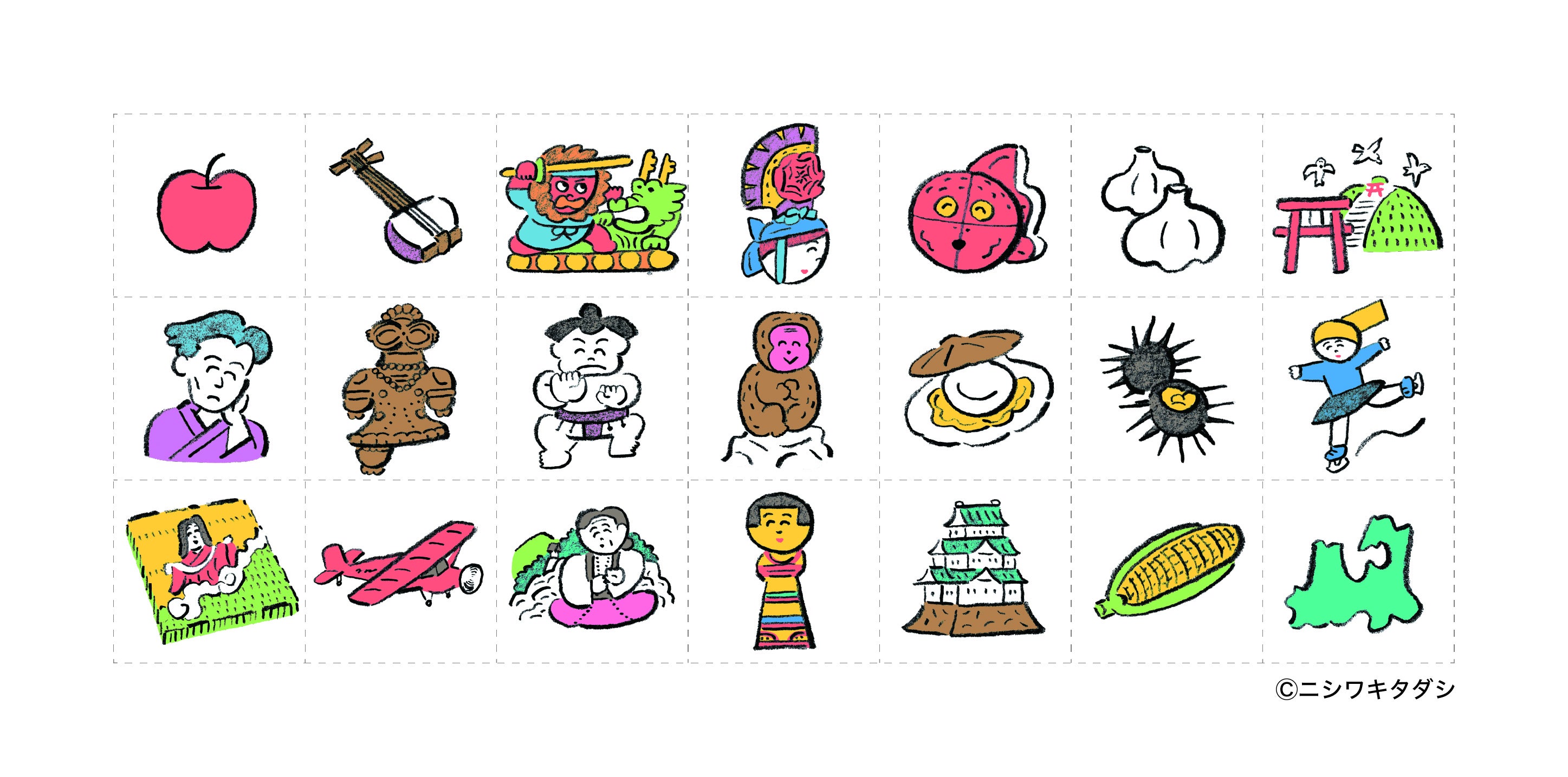 あおもりアッテラに描かれているイラストは、青森県の代表的な名産品や文化。