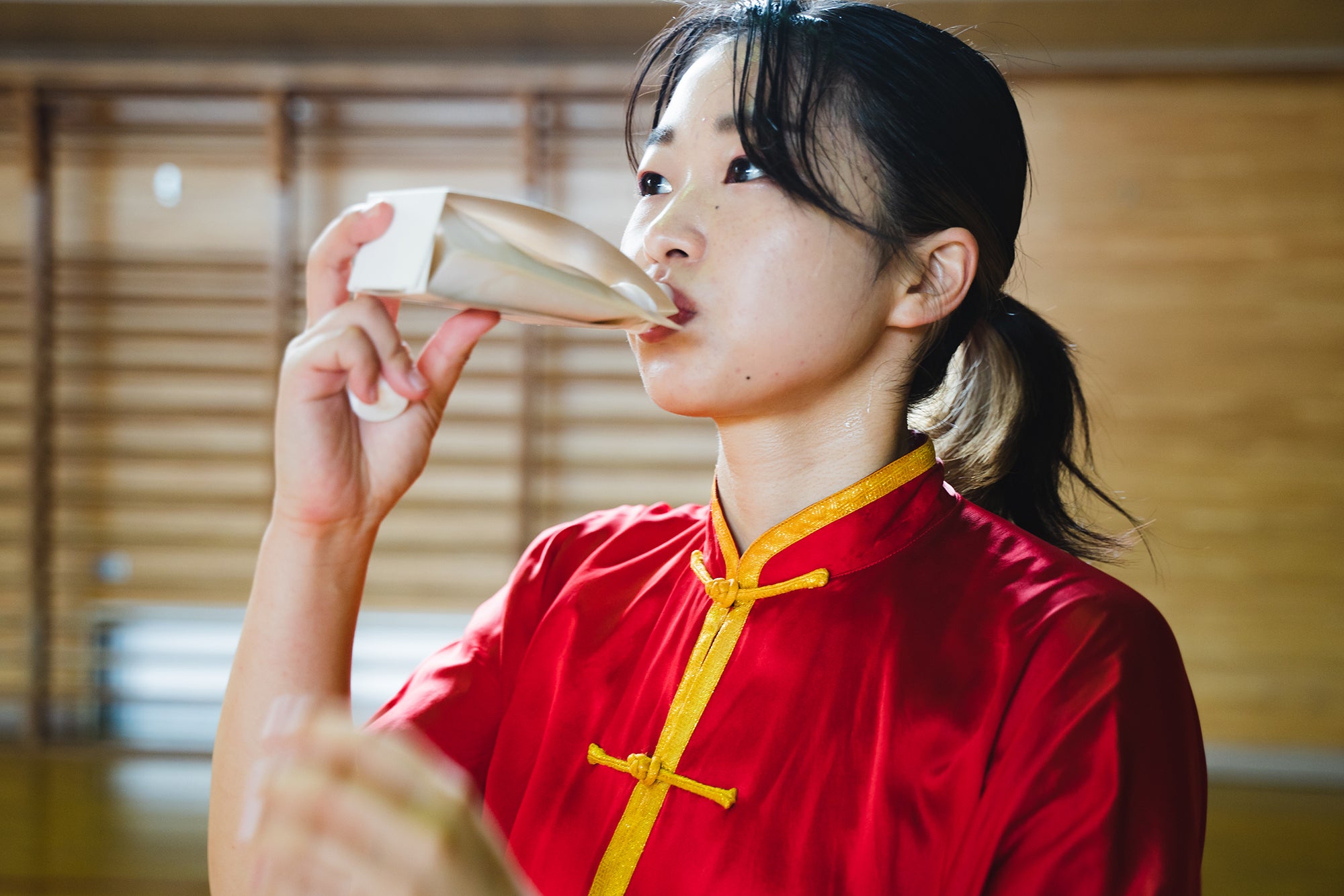 「武術太極拳(カンフー)は、自分の演武に点数をもらって競う、表現のスポーツです。短い時間ながら、爆発的に力を発揮する必要があるので、ベストなコンディションを常に保てるように、エネルギーを補給する必要があります。競技開始時刻に合わせて、体内に摂取するものを決めていますが、今回は、ゼリー飲料の代わりに『米糀のあまさけ』を取り入れてみました。