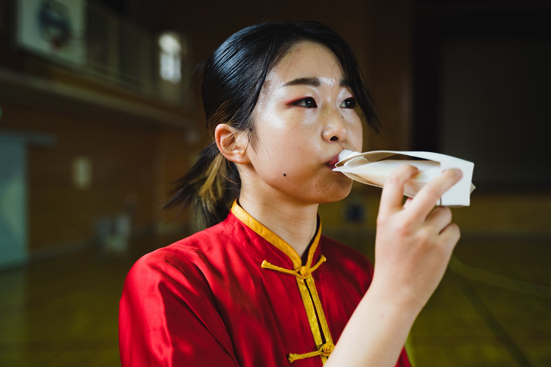 武術太極拳(カンフー)は、自分の演武に点数をもらって競う、表現のスポーツです。短い競技時間で爆発的に力を発揮する必要があるため、ベストコンディションを保つためにはエネルギーの補給が重要となります。そのため、時間を決めて必要なエネルギーを摂取することが、小田桐さんの演舞当日のルーティンなんだとか。普段は演舞1時間前に摂取するエネルギー補給ゼリーに代わり、今回は『米糀のあまさけ』を摂取してもらいました。
