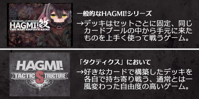 HAGMI!ではカードセットの制作時、それがどんなフォーマットのものでもタクティクスでの使用を考慮したデザインを行っているため、デッキを構築する人によって多種多様な部隊が編成されることでしょう。