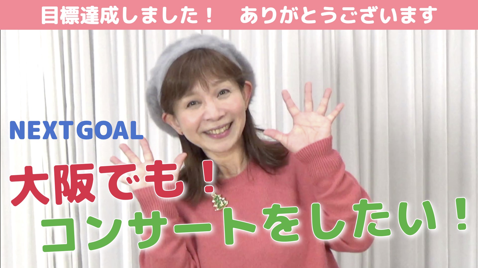 「山野さと子 デビュー40周年記念CD制作&コンサートを開催したい」プロジェクトオーナーのask musicです。コロナ禍の2020年の最後にこのような喜びをいただけましたこと、皆様のご支援・ご協力に心より感謝申し上げます。さて、プロジェクト終了までの残り約2週間、NEXT GOALに挑戦したいと思います。【NEXT GOALにむかって!】みなさま、こんにちは。山野さと子です。11月3日にスタートしたこのプロジェクトは、12月25日に目標額に達しました! やったー!クリスマスの日に、いったい誰がこんなドラマチックなプレゼントの演出をしてくれたんだろう、なんて思ったほどです! これもみんな、あたたかい言葉で励まし、応援し続けてくださったみなさんのおかげです。本当に本当にありがとうございます! これからのアルバム制作、コンサートの準備に、ますます気合が入ります。待っていてくださいね。このプロジェクトが終了する1月11日まで、まだ少し時間があります。そこで、次のゴール…NEXT GOALを目指したいと思います!それは、【生まれ育った地元大阪でもデビュー40周年コンサートをしたい】です!両親や家族、学生時代の友人たちやお世話になった方々にも、コンサートを観ていただきたい。東京までは行けないけれど、大阪なら行ける! そういう方にも生でコンサートをお届けしたい!と思っています。場所は…思い出の「バナナホール」で。日程は、8月29日(日)です!バナナホールは毎年のようにバースデーライブをさせてもらった場所で、たくさんの思い出がある大好きなホールなんです。あのステージにもう一度立てたら…そんな思いでいっぱいです。もちろん、東京で開催する2月14日のコンサートとはまた違ったコンサートにするつもりです!そこで、NEXTGOALの達成に向けて、3つの追加リターンを用意しました。*追加リターン 12月28日(月)~・大阪「バナナホール」ご招待 コース *100名限定(6000円) 8/29(日)大阪「バナナホール」で開催する40周年記念コンサートのチケットをお届けします。・大阪 コンサート LIVE配信視聴コース(3000円・無制限) 8/29(日)大阪での40周年記念コンサートのLIVE配信アドレス・パスワードをお知らせします。・大阪 コンサート DVDコース(5000円・無制限) 8/29(日)大阪での40周年記念コンサートの映像を「DVD-R」でお届けします。ぜひ応援、ご支援、ご声援…!よろしくお願いいたします。甘えてばかりですが、どうぞみなさまのお力をお貸しください。よろしくお願いします♪山野さと子NEXTGOALの達成のため、ぜひプロジェクトをご友人やSNSにてシェアいただけますと幸いです。 こちらのリンクをシェアいただければと思います。 https://camp-fire.jp/projects/view/332595それでは、皆さんの期待に応えられるよう、最後まで全力を尽くして取り組んで参ります。