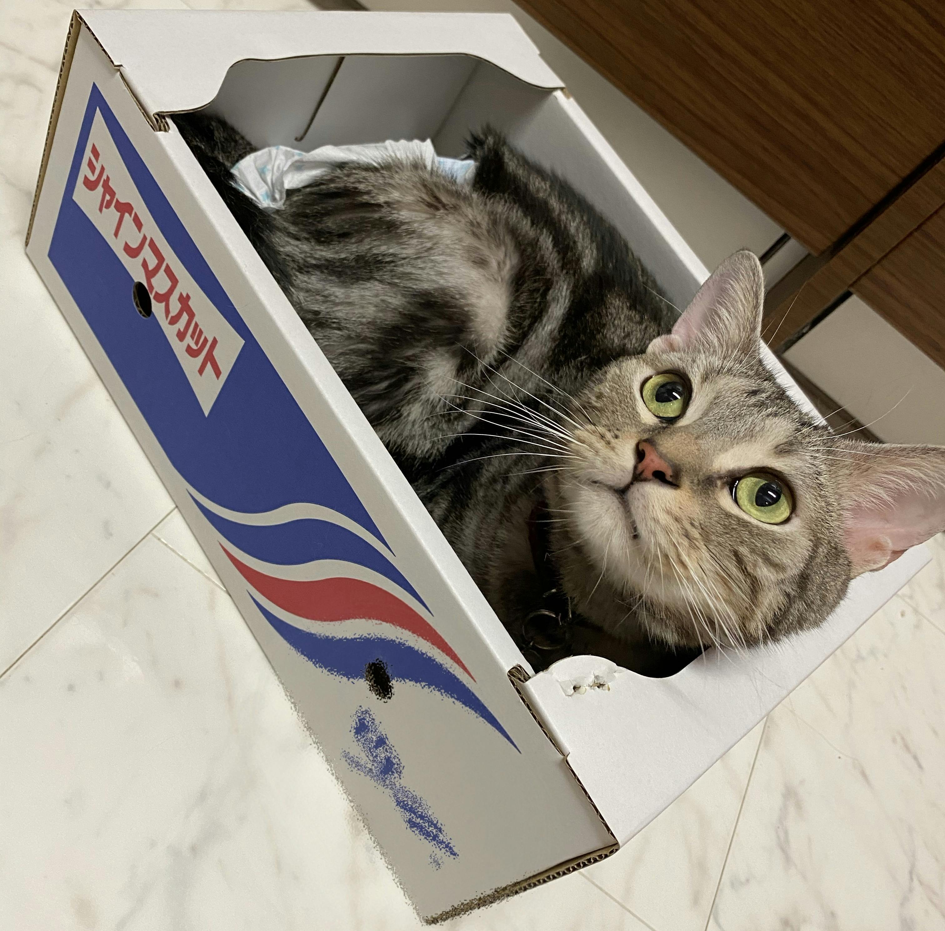 ミントはシャインマスカットの箱が気に入ったらしく、何度も何度も失敗しながら(後ろ足に力が入りません)それでも諦めず、無事箱の中に入れました。