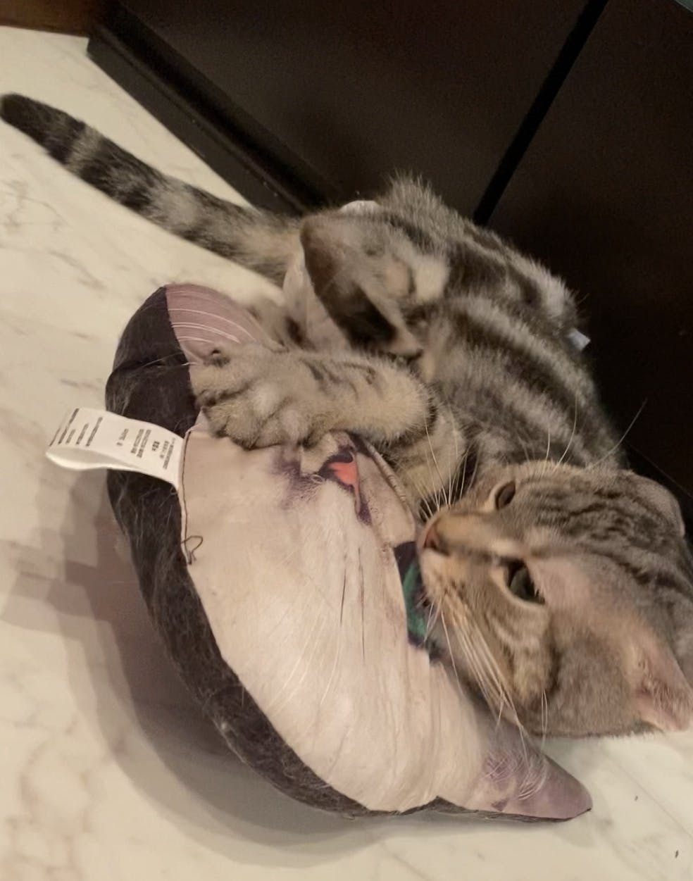 今日のミントは猫クッションを蹴り蹴りして遊んでました。 あれ? わりと足が動いてる♡嬉