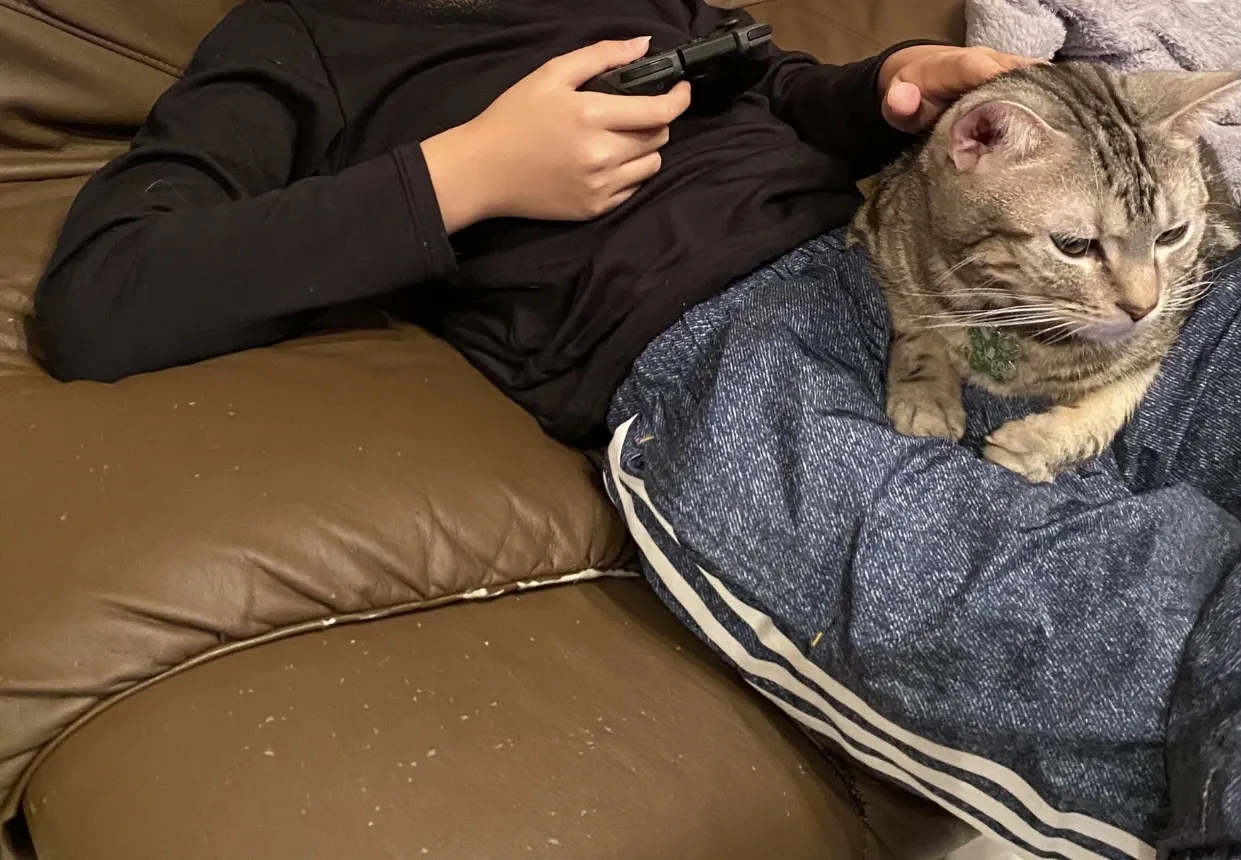 大晦日 息子の膝の上でまったり紅白を見ているミント(^^)