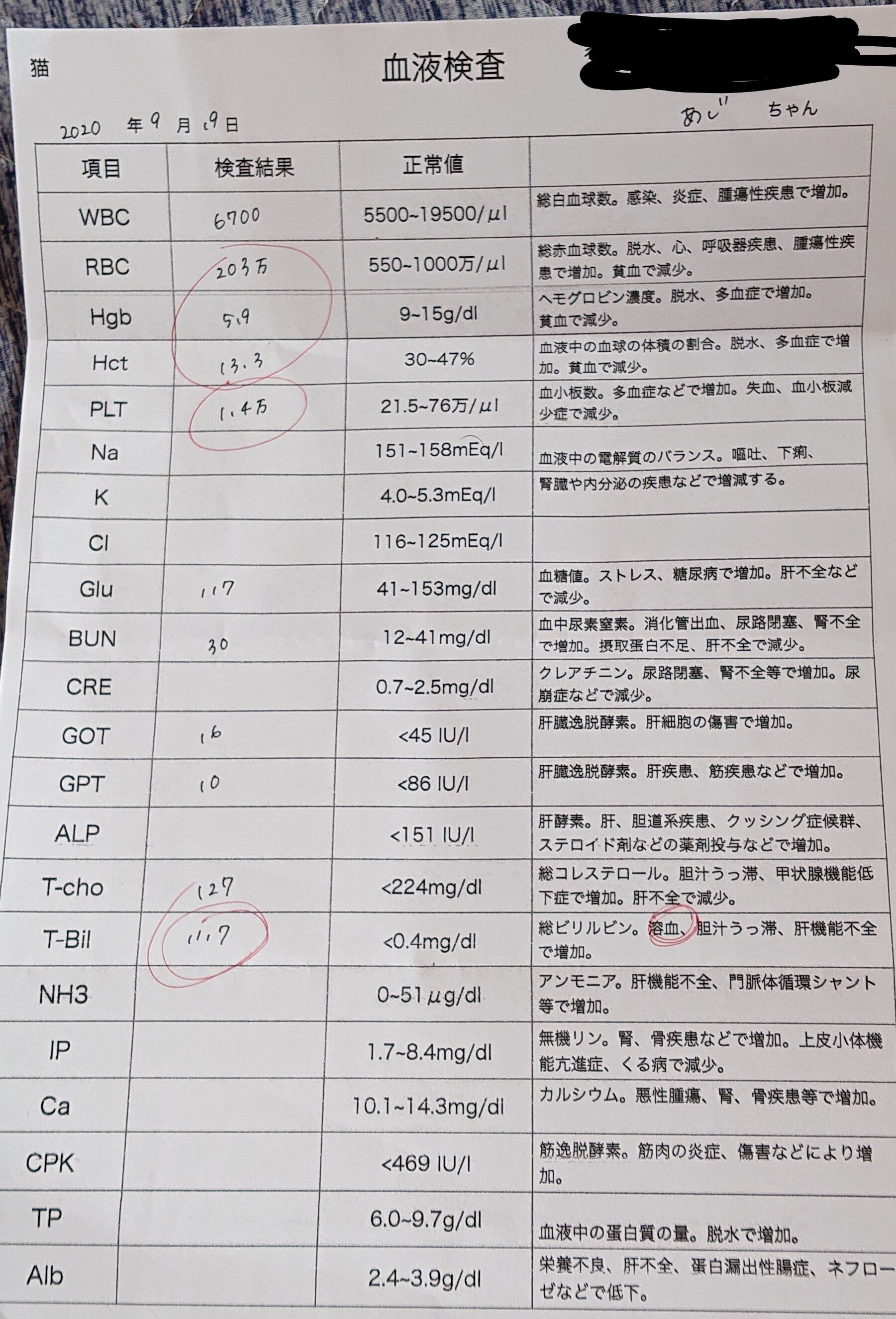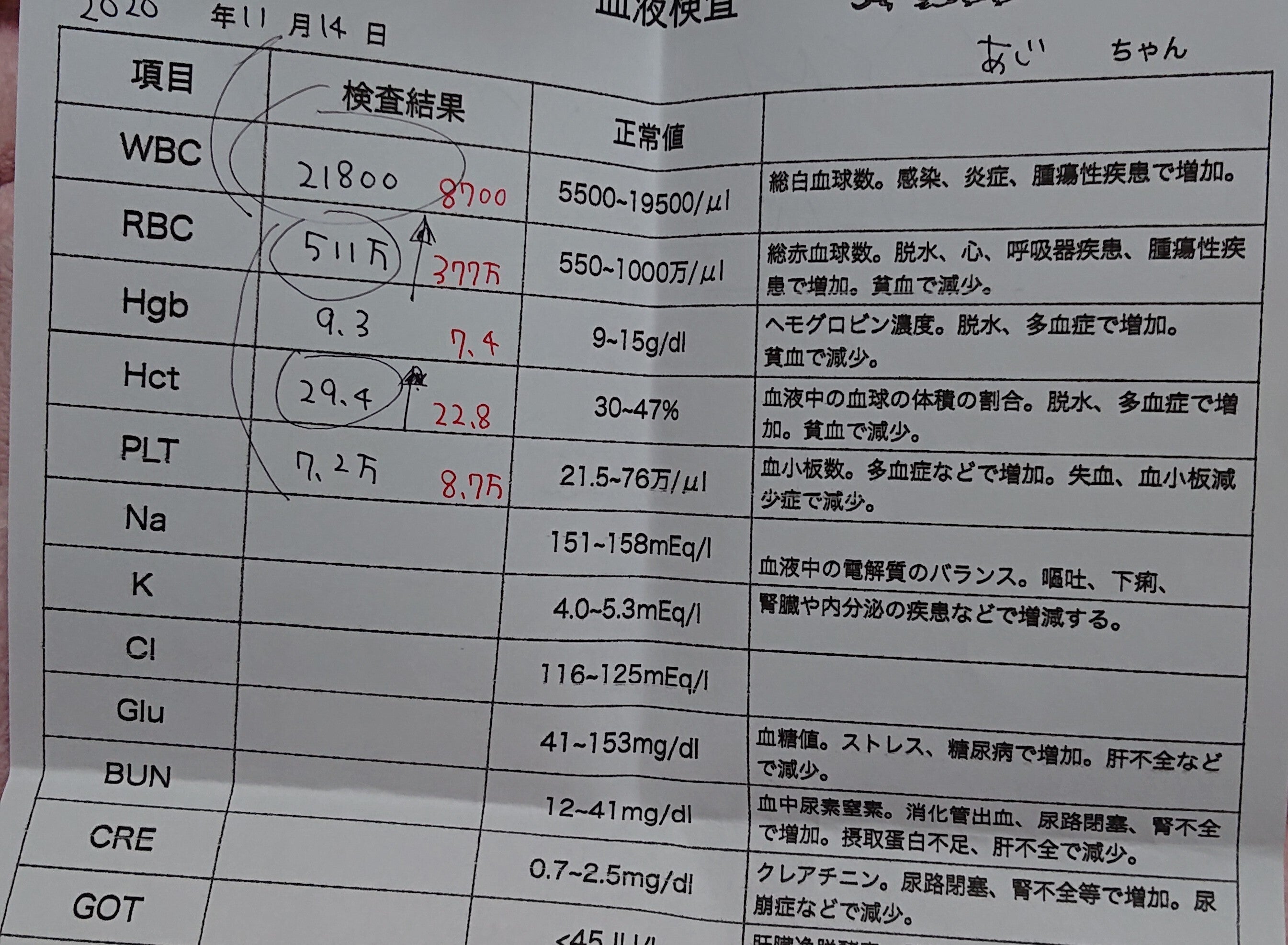 2020/10/12 17:43こまめに報告が出来ずすいません…あじは、通院の度に注射・点滴を施行していますが注射している所が痒くなってしまうようで掻きむしってしまい少し皮膚炎をおこしてしまった為、軟膏を塗布する事になりました¯꒳¯٥あじは良くも悪くも状態が変わらずといったところでしたが本日10/12受診時先生よりもしかしたら血が増えたかも!との事で血液検査をしたところ……ほんの少しだけではありますが血がつくられていましたので報告させて頂きます!!(赤字が前回の検査、黒字が今回の検査です) もっと見る