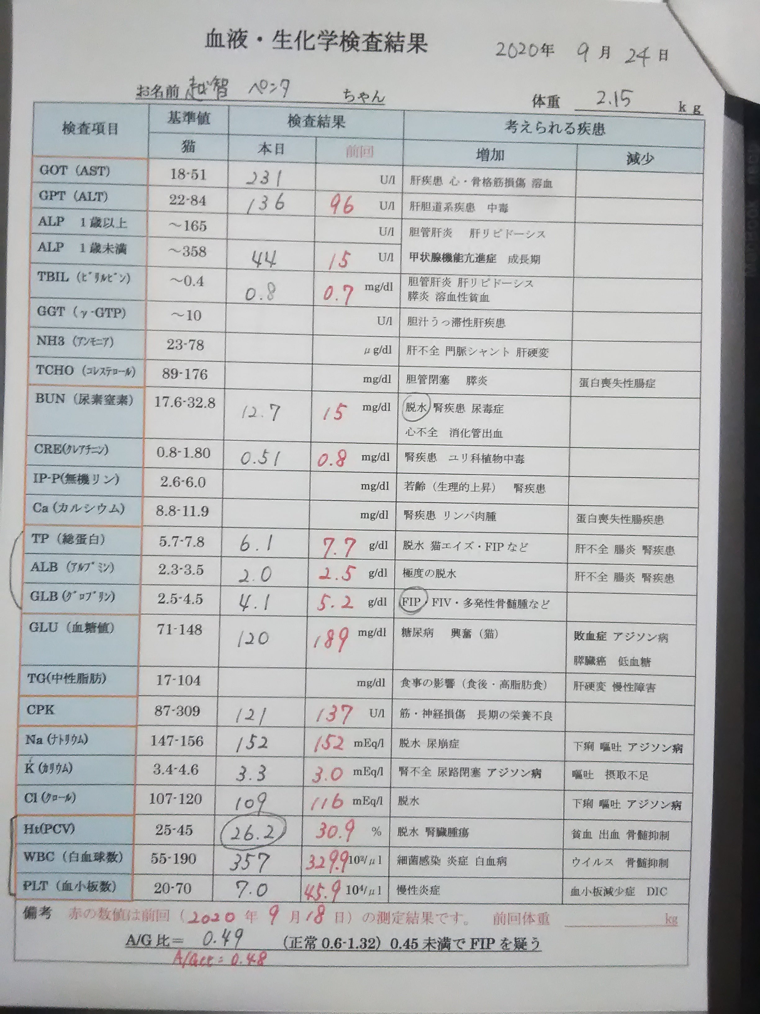 また、A/G比というのは、アルブミンという物質とグロブリンという物質の比率のことらしく、この数値が1を大きく下回っていると、FIPの疑いがあるそうです。