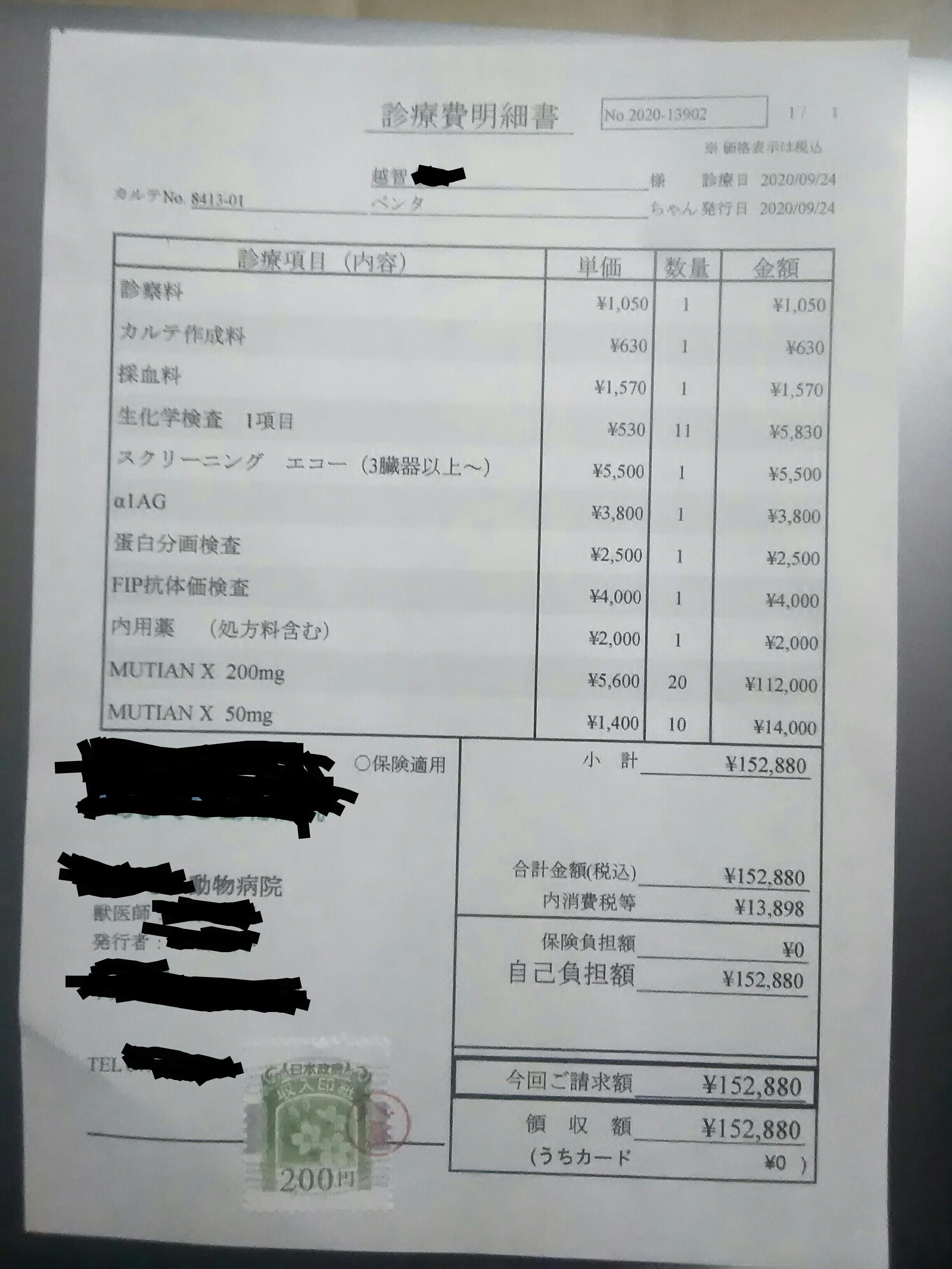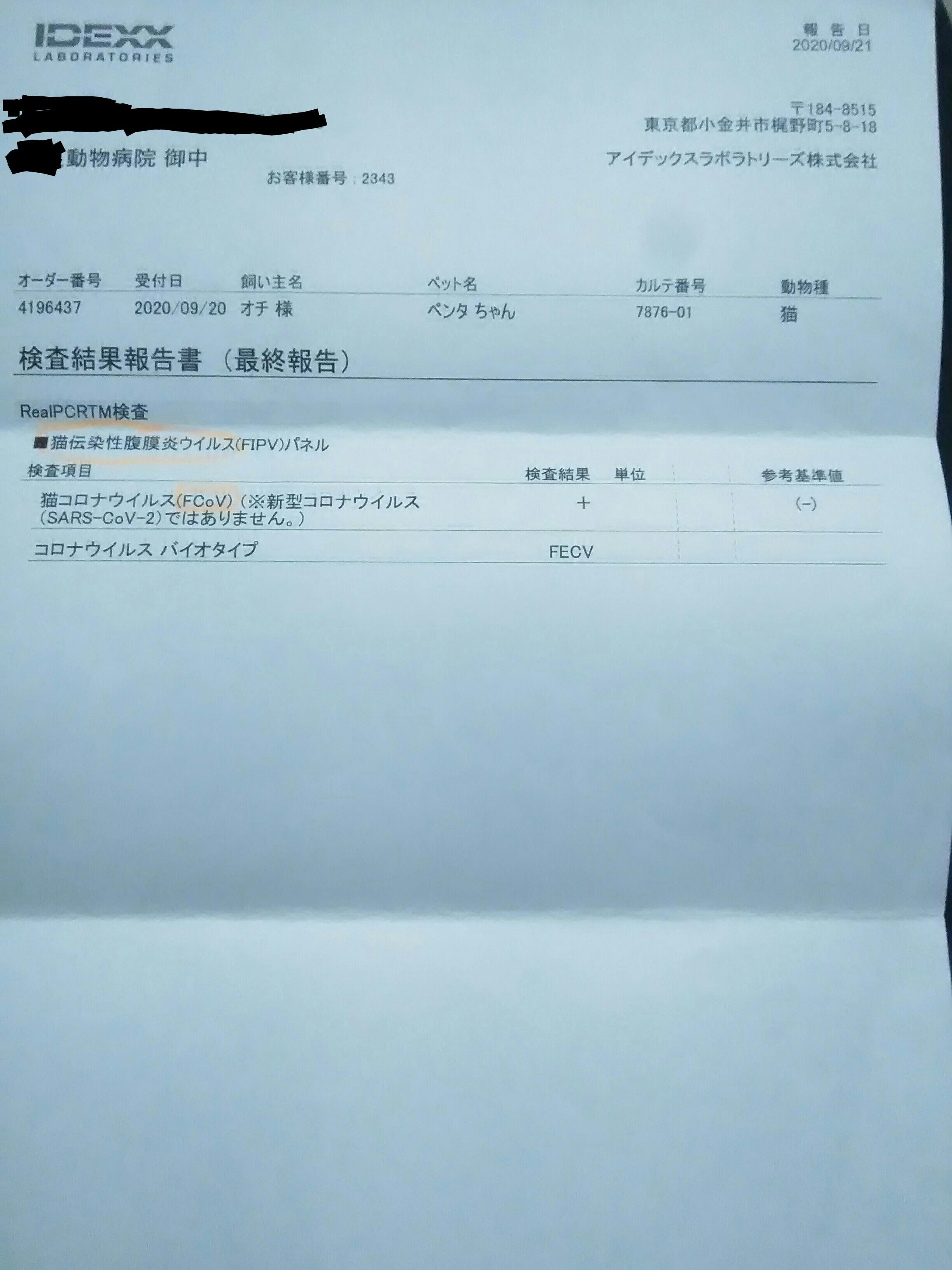 後日、外注検査で精密検査をしていただき、9月22日(火)には正式にFIP陽性であると診断されました。