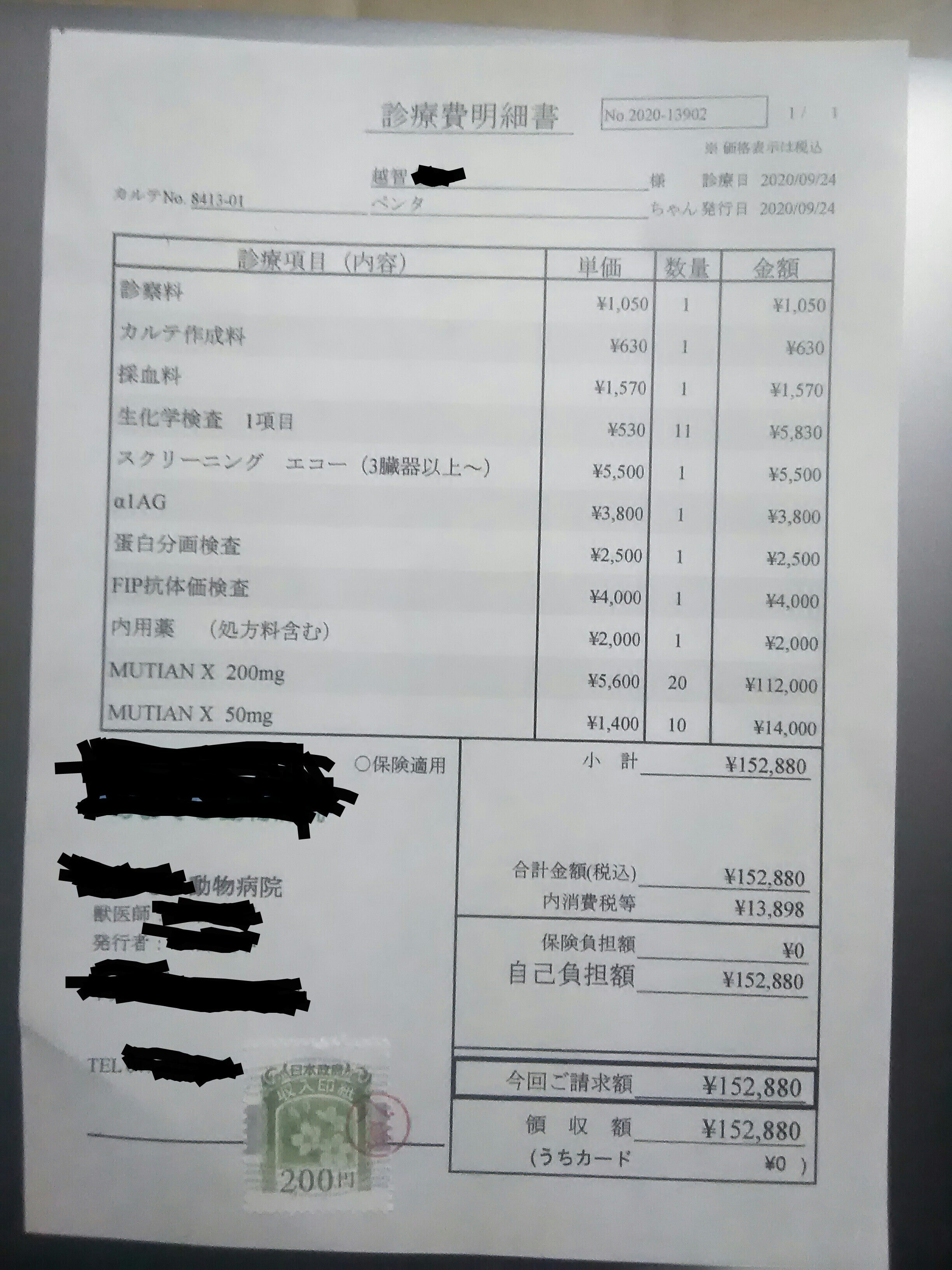 また、投薬開始から1、2、6、10週間後には、動物病院さんにうかがって、MUTIANがしっかり効いているかどうかを判定する検査を受ける必要があり、細かい数字は聞いておりませんが、1、2週間後の検査は1回3~4万円、6、10週間後の検査は1回2万円ほどかかると説明を受けました。