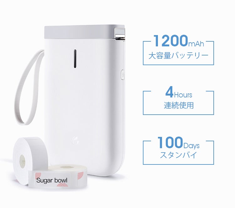 新時代の便利アイテムに相応しく、1200mAhのリチウム電池が内蔵されているMicro USB充電式。約3~4時間のフル充電で、最大ラベルシール10本分もの印刷が可能です(使用状況や環境により、異なる可能性がございます)。
