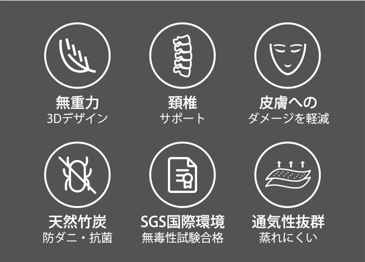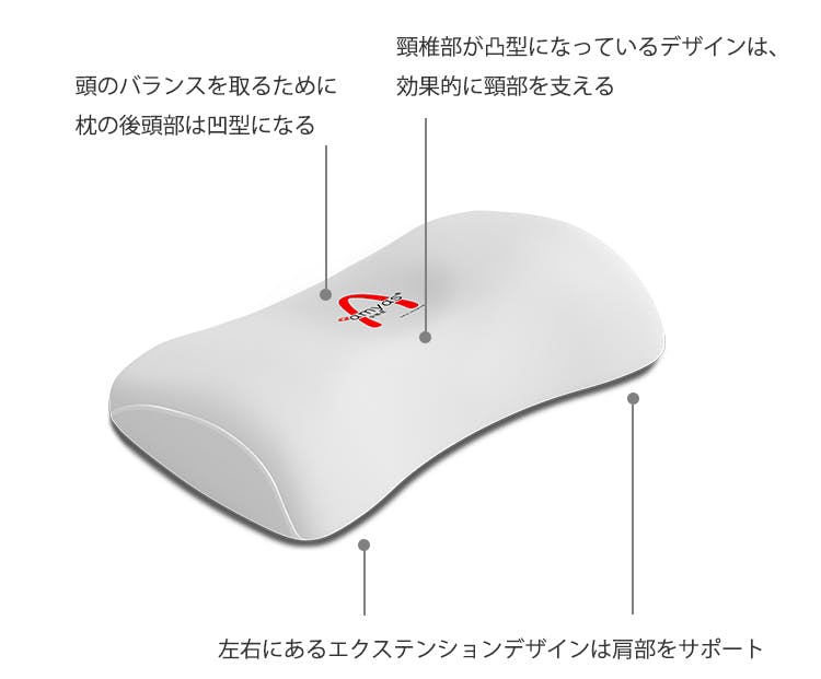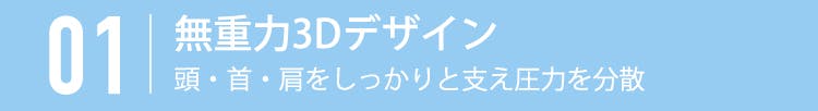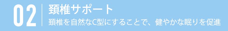 頭部・頸部・肩部にぴったりフィットすることで、仰向けでも横向きでも、自然的なC型ラインを維持することができ、頭部と頚椎のバランスを保ちます。3点がしっかりと支えられることで、圧力が分散され、まるで無重力のような今までに感じたことのない感覚を味わえますよ!