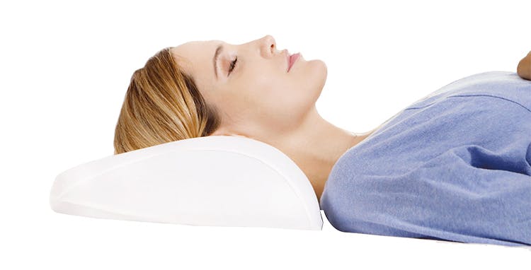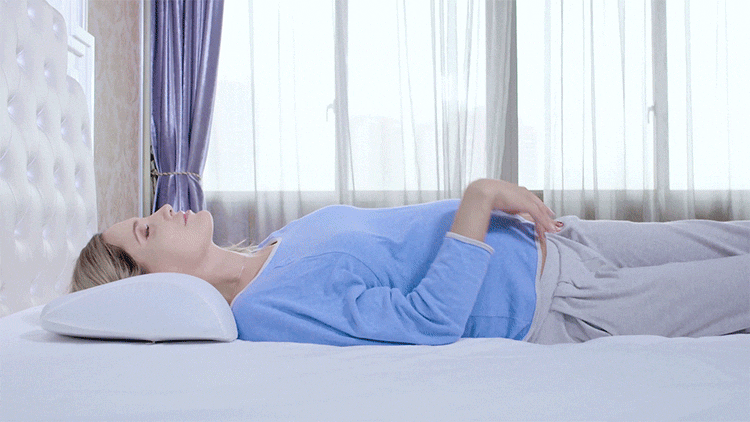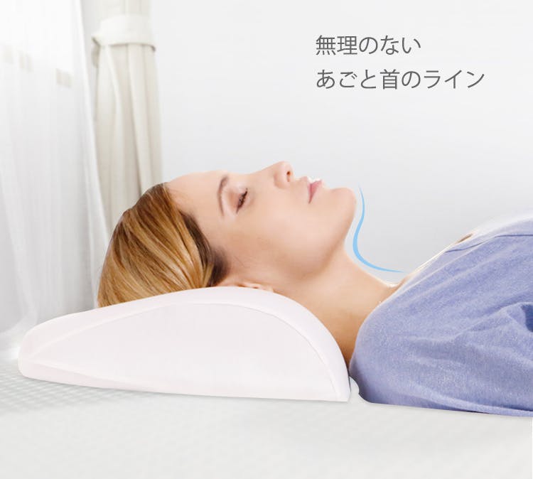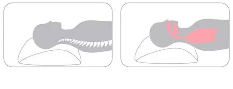 枕の後頭部を凹型にすることで自然とあごの先が上がり、舌が前方に移動すると呼吸もスムーズにできるようになります。イメージ的には学校で習った人工呼吸の最初の状況を思い出して頂くと分かりやすいかもしれません。いびきの根本原因である喉の狭さも解消されます。
