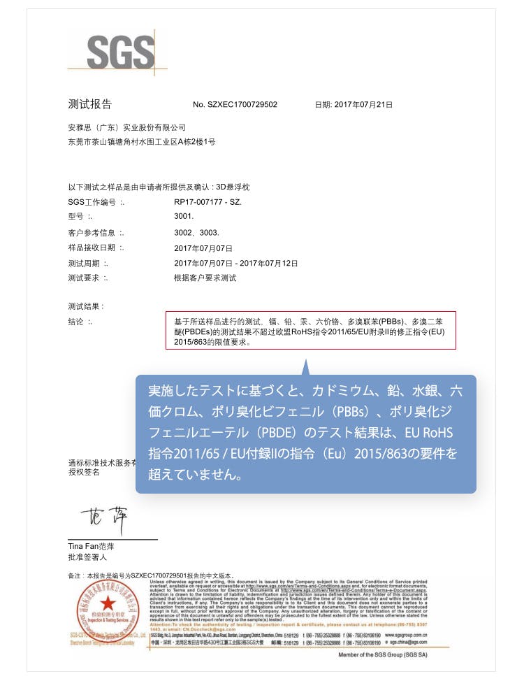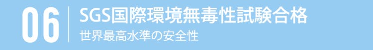 世界の2,600以上のオフィスおよび研究所にて、検査、検証、試験および認証を行っている世界的なトップ企業「SGSグループ」。品質や高潔性の面でも国際的な水準として認められているこの企業に当製品を依頼し、ヘビーメタル(重金属)やホルムアルデヒドなどの人体に有害な物質を含んでいないかを検証済みです。