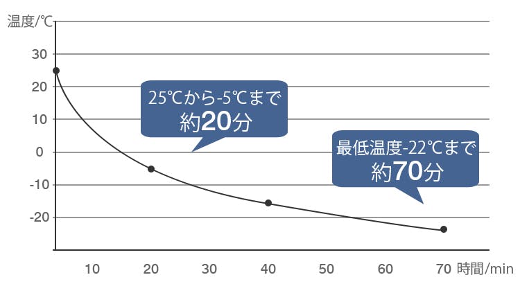 コンプレッサー冷却を採用した「BCD-30」は、急速冷却が可能。外気温度が25℃だった場合、10分後には5℃に。最大冷却温度-22℃まではわずか約70分!