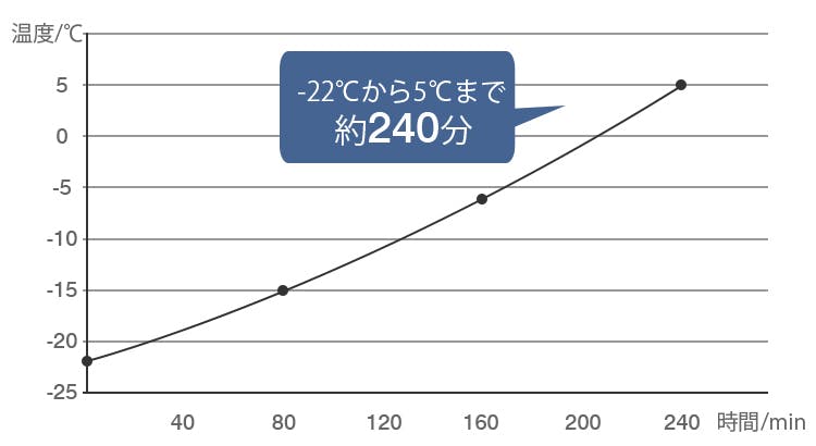 A.ー22℃まで冷却して電源をオフにした場合、約4時間後の庫内温度は5℃になります。アイスパック等と一緒に収納すると、より保冷効果を得ることができます。
