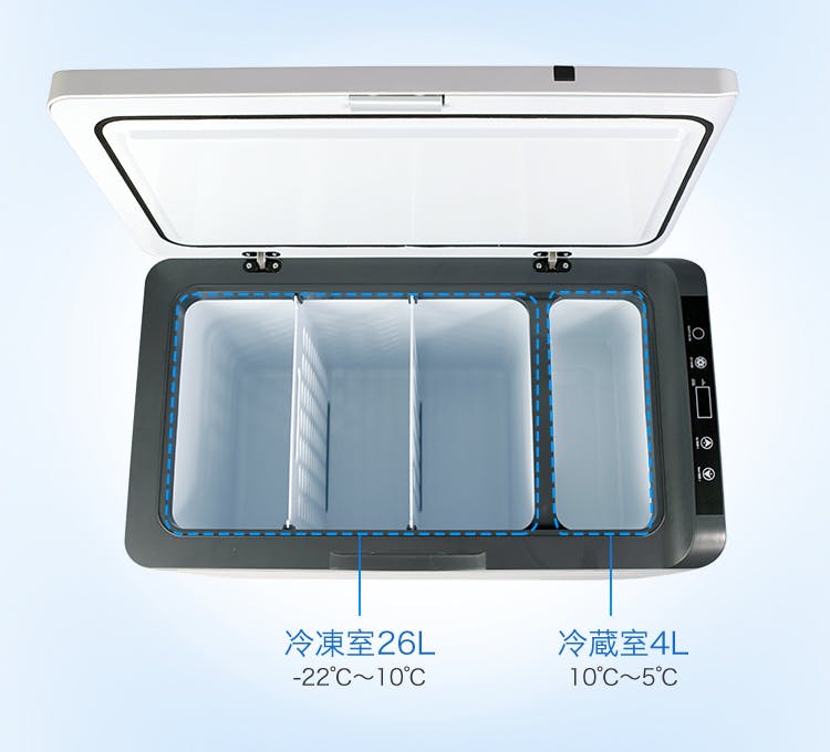 冷凍スペース26Lと、冷蔵スペース4Lの合計30L大容量サイズ。