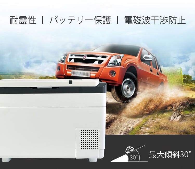 車載として使用する場合、気になるのが耐震性。「BCD-30」なら、最大30°の傾斜までなら冷却・保冷効果に影響はありません。
