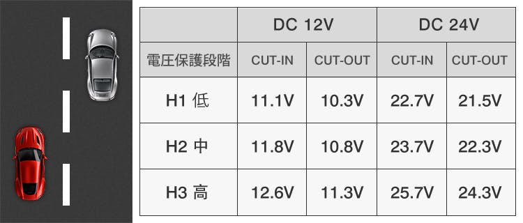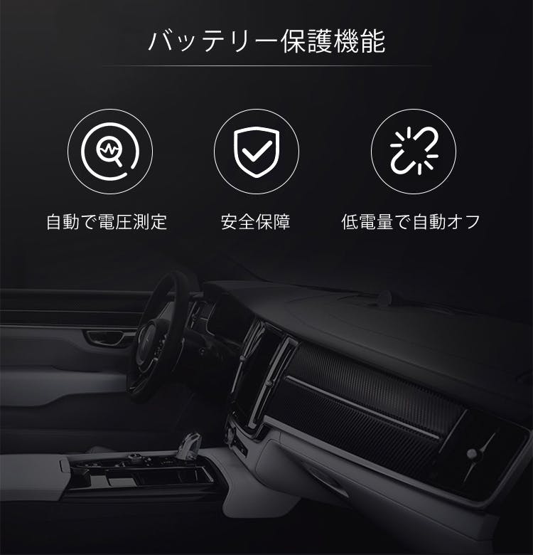 「BCD-30」は車の電圧を自動測定、弱まっているのを感知すると自動オフする安全機能が搭載。気負うことなく、お使いいただけます。
