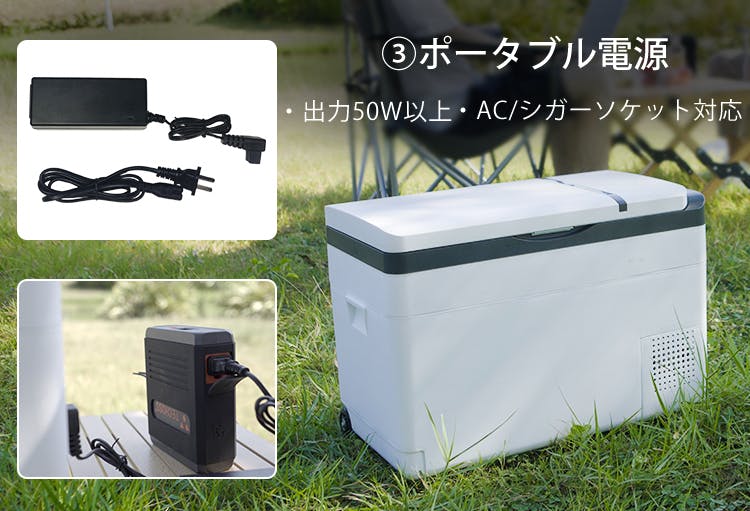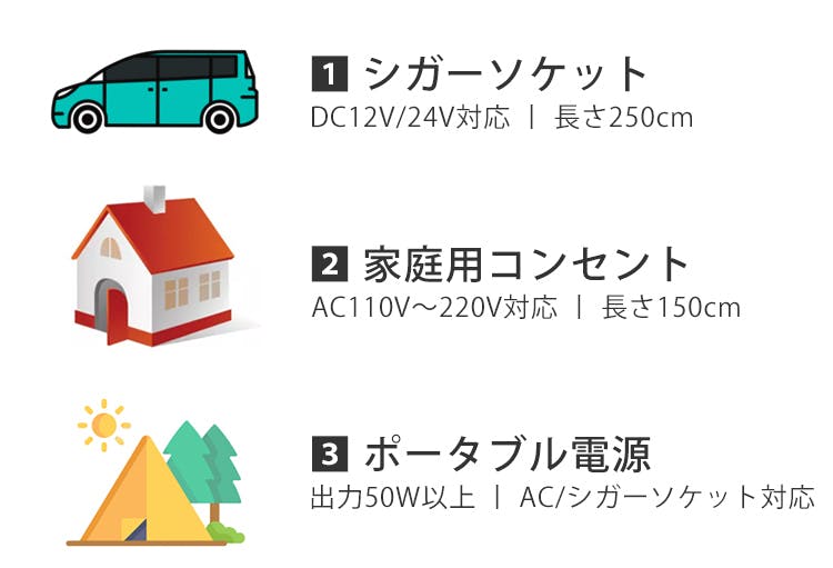 ポータブル電源が出力50W以上・ACまたはシガーソケット対応であるかを事前にご確認ください。