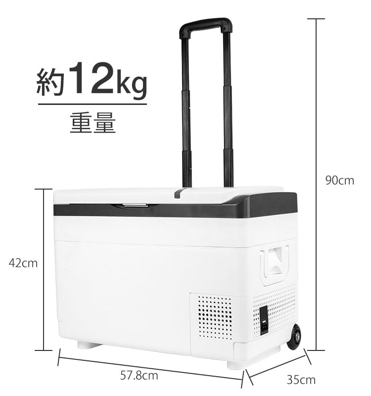578mm×350mm×420mm、重さは約12kg。トランクにも収納できる、よくあるサイズの冷蔵冷凍庫です。