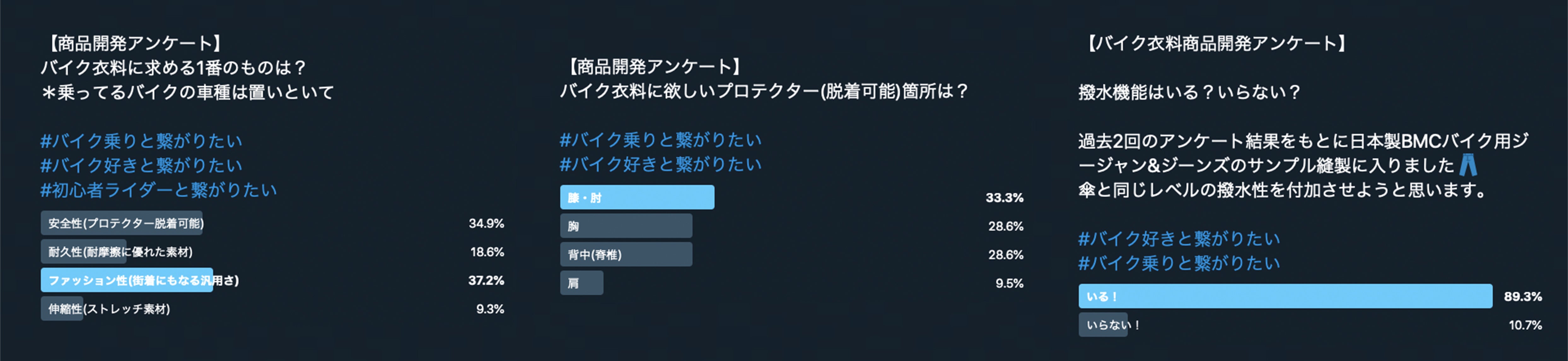 今回のファッション × バイク × ファンクション× セーフティー な【ライダー専用デニムウェア】は、事前に延200名のライダーにアンケートさせて頂き、その要望をベースに開発した『ライダーの意見が反映された』開発になっています٩( ᐛ )و