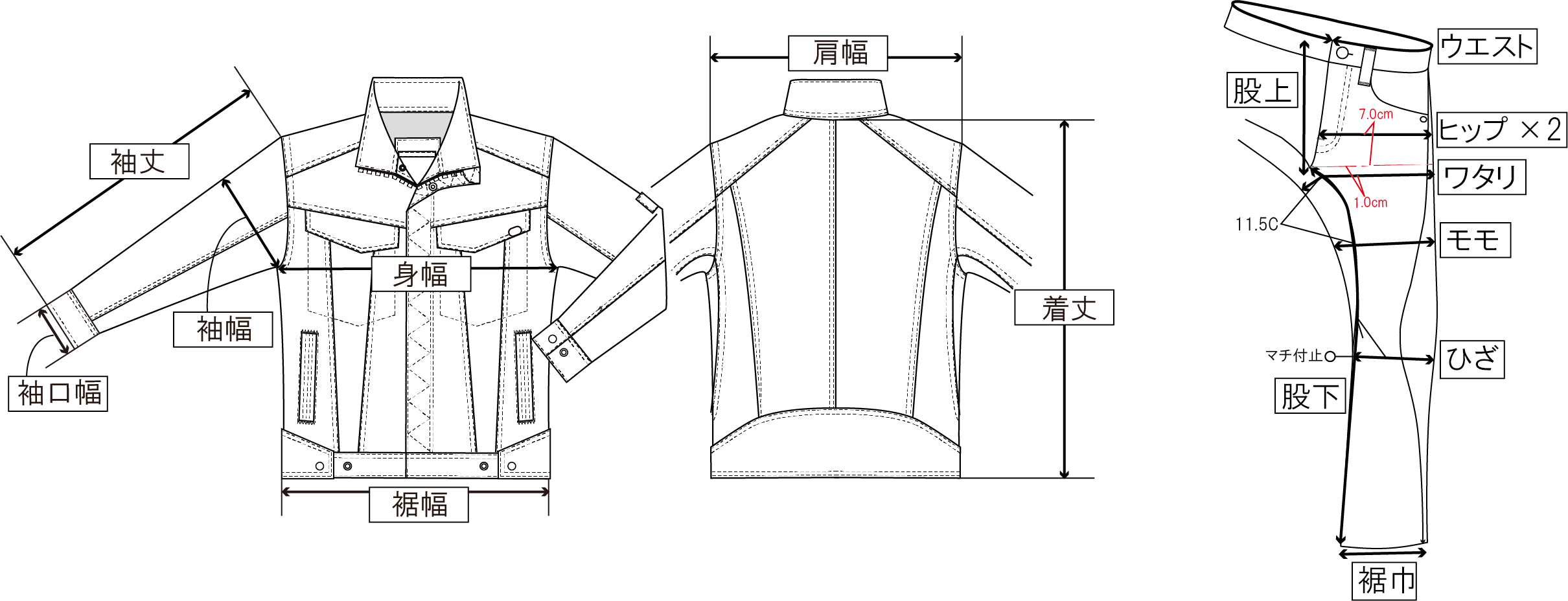 ジーンズにもデニムジャケットにもプロテクターはフル装備でジャストフィットです!!プロテクター装着を前提としたサイズ感(赤字の身幅を参照)になっているので、Mの方はMを上下で支援すればバッチリですよ。
