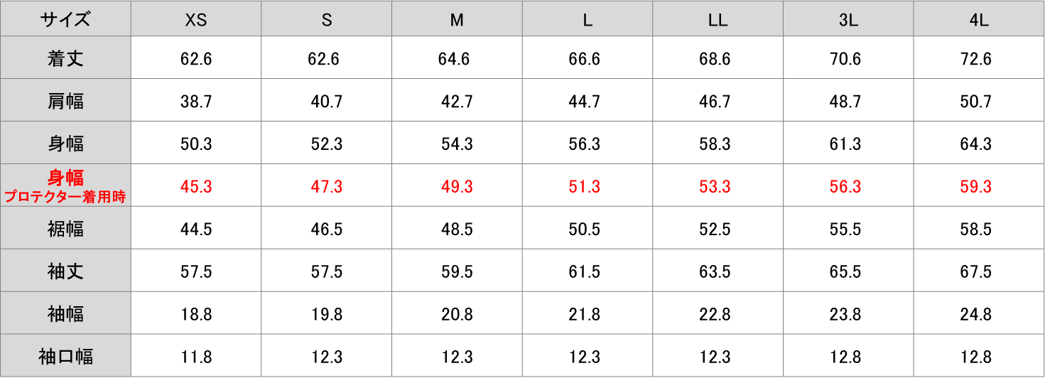 *身幅は、表内赤字 「身幅 プロテクター着用時」の寸法をご参考にして下さいませ。