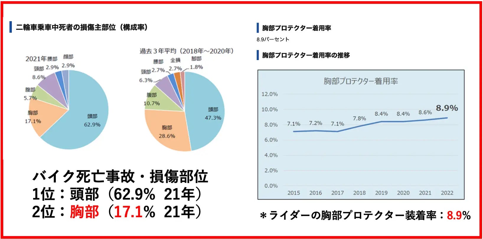 バイクでの移動は、「ちょっとそこまで」の距離でも注意点が多々あり、制限されていた事が多数ありました。それが「快適さ」「安全性」「ファッション性」の3つです。22年バイク死亡事故のうち、胸部損傷による割合は17.1%にも関わらず、ライダーの胸部プロテクター使用率は8.9%と著しく低いのが現状です。